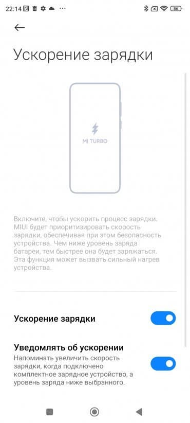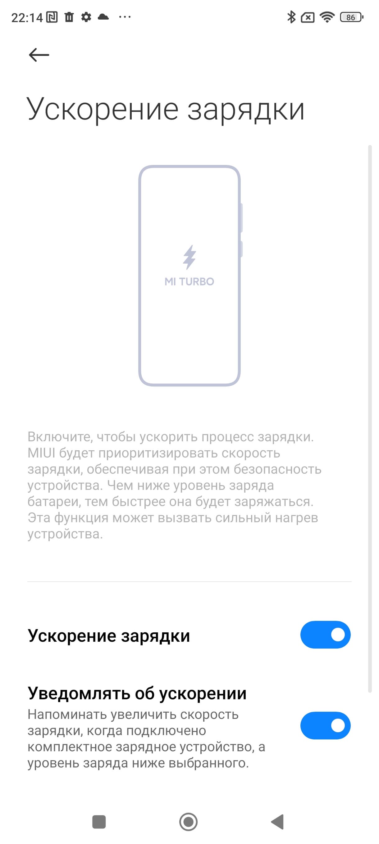 Поддерживается очень быстрая зарядка: от комплектного зарядного устройства мощностью 120 Вт смартфон может зарядиться за 20 минут с фирменной технологией HyperCharge. Для этого нужно зайти в раздел о батарее в настройках и вручную включить функцию быстрой зарядки. Без нее аппарат зарядится примерно за 35 минут.