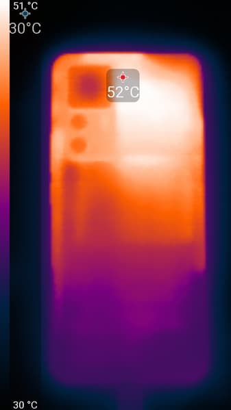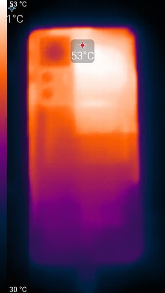 Нагрев больше в верхней части аппарата, что, видимо, соответствует расположению микросхемы SoC. По данным теплокамеры, максимальный нагрев составил 53 градус (при температуре окружающего воздуха в 24 градуса), это типичный нагрев в случае данного теста в сравнении с другими современными производительными смартфонами. Для более-менее точного определения температуры на заднюю поверхность смартфона пришлось наклеить кусок тонкой клейкой ленты, что увеличило коэффициент излучения поверхности до значения, близкого к единице. Без клейкой ленты температура, определенная с помощью теплокамеры, была занижена — впрочем, всего на один градус.