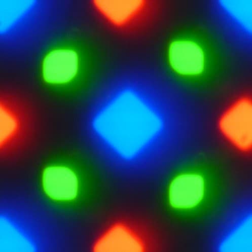 В этом экране используется матрица Super AMOLED — активная матрица на органических светодиодах. Полноцветное изображение создается с помощью субпикселей трех цветов — красного (R), зеленого (G) и синего (B), но красных и синих субпикселей в два раза меньше, что можно обозначить как RGBG. Это подтверждается фрагментом микрофотографии: