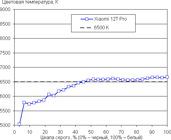 Цвета на экране Xiaomi 12T Pro немного перенасыщены, а цветовой баланс заметно отличается. Напомним, что фотография не может служить надежным источником сведений о качестве цветопередачи и приводится только для условной наглядной иллюстрации. В частности, выраженный красноватый оттенок белого и серого полей, присутствующий на фотографиях экрана Xiaomi 12T Pro, при перпендикулярном взгляде визуально отсутствует, что подтверждается аппаратными тестами с помощью спектрофотометра. Причина в том, что спектральная чувствительность матрицы фотоаппарата неточно совпадает с этой характеристикой человеческого зрения.