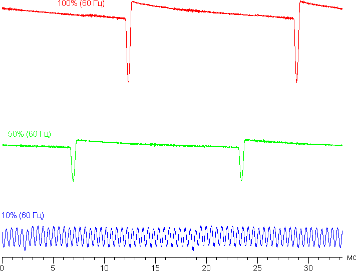 На высоком и среднем уровне яркости присутствует значимая модуляция с частотой примерно 60 или 120 Гц. На рисунке ниже приведены зависимости яркости (вертикальная ось) от времени (горизонтальная ось) для нескольких значений настройки яркости. Сначала для режима с частотой обновления 60 Гц: