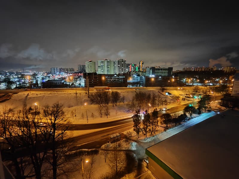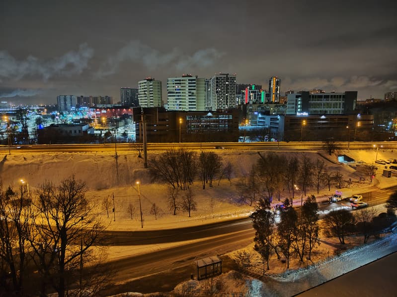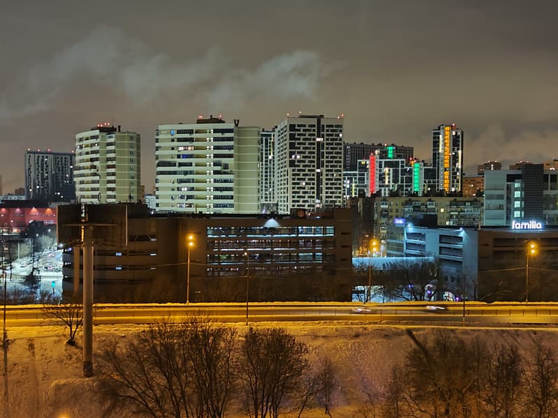 В ночном режиме основная камера выдает эффектную, высокодетализированную картинку, мягко прорабатывает источники света, не задирая в целом экспозицию. Цвета получаются немного более едкими, кислотными, но картинка действительно выглядит ночной. При съемке на широкий угол и с цифровым зумом количество деталей стремительно падает, такие снимки годятся разве что в качестве миниатюр.