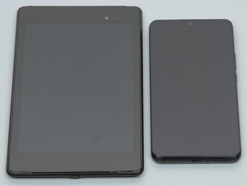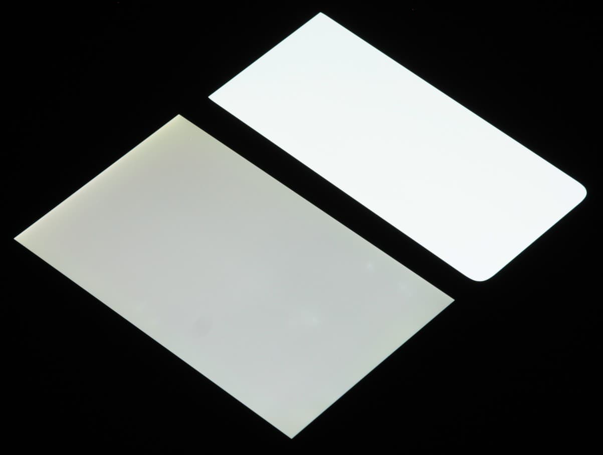 Лицевая поверхность экрана выполнена в виде стеклянной пластины с зеркально-гладкой поверхностью, устойчивой к появлению царапин. Судя по отражению объектов, антибликовые свойства экрана лучше, чем у экрана Google Nexus 7 (2013) (далее просто Nexus 7). Для наглядности приведем фотографию, на которой в выключенных экранах отражается белая поверхность (слева — Nexus 7, справа — Xiaomi 12T, далее их можно различать по размеру):
