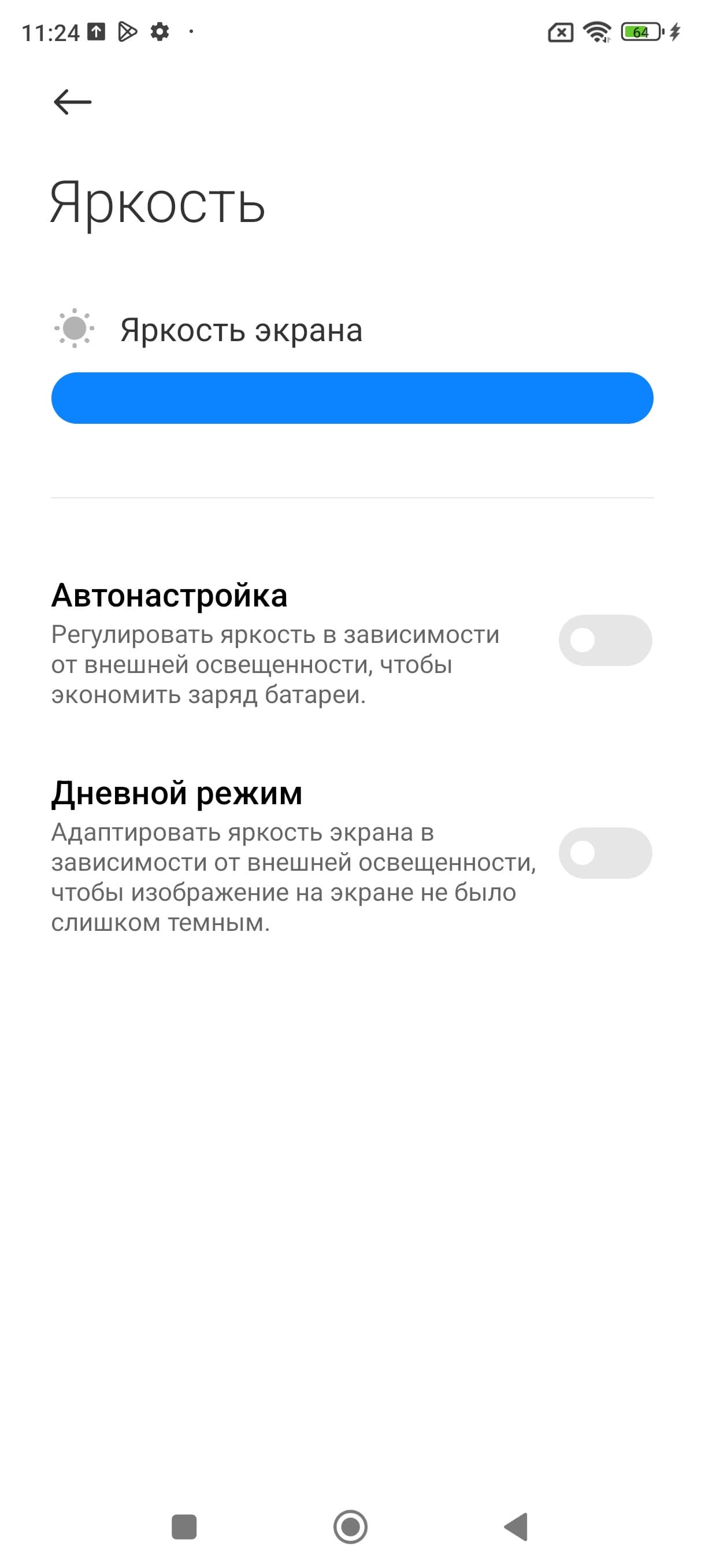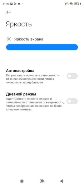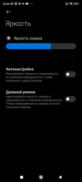 Минимальное значение яркости — 1,8 кд/м², поэтому в полной темноте яркость можно понизить до комфортного значения. В наличии автоматическая регулировка яркости по датчику освещенности (он находится на фронтальной панели близко к ее верхнему краю правее решетки фронтального громкоговорителя). В автоматическом режиме при изменении внешних условий освещенности яркость экрана как повышается, так и понижается. Работа этой функции зависит от положения ползунка регулировки яркости: им пользователь может попытаться выставить желаемый уровень яркости в текущих условиях. Если не вмешиваться, то в полной темноте функция автояркости уменьшает яркость до 3 кд/м² (низковато), в условиях освещенного искусственным светом офиса (примерно 550 лк) устанавливает на 100 кд/м² (нормально), а условно на прямом солнечном свету яркость достигает 730 кд/м² (до максимума, так и нужно). Результат нас не устроил, поэтому в полной темноте мы увеличили яркость до 12 кд/м², получив для трех условий, указанных выше, следующие значения: 12, 110, 730 кд/м² (что и было нужно). Получается, что функция автоподстройки яркости работает адекватно и в какой-то степени позволяет пользователю настраивать свою работу под индивидуальные требования.
