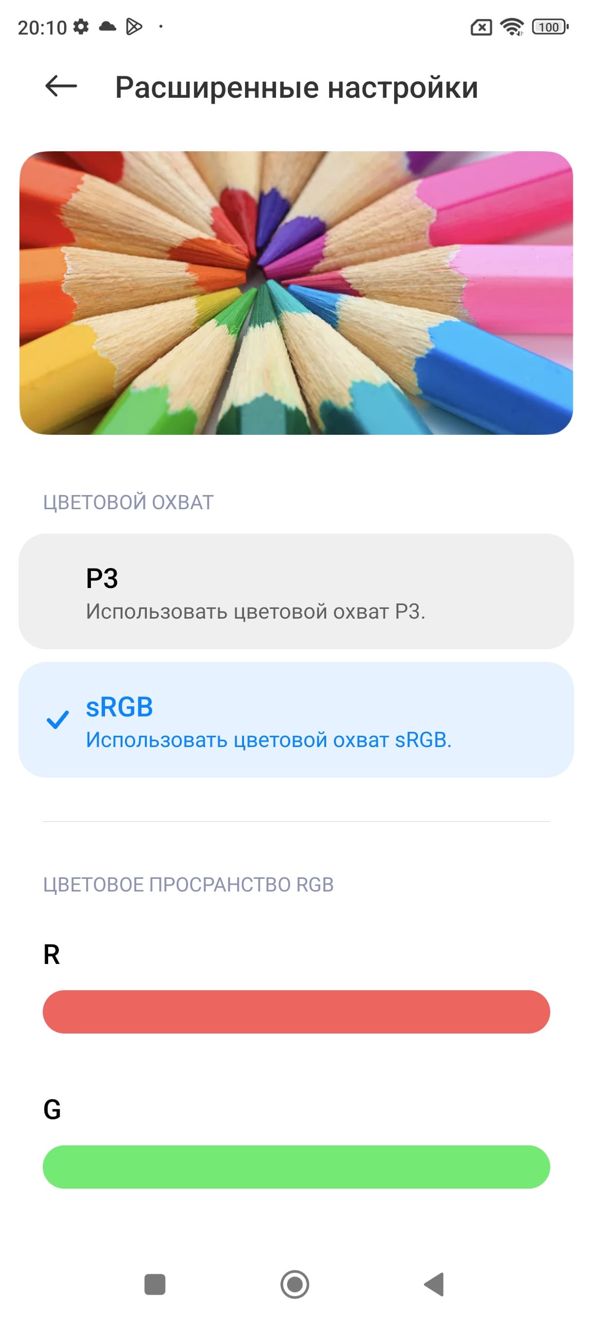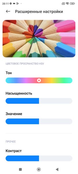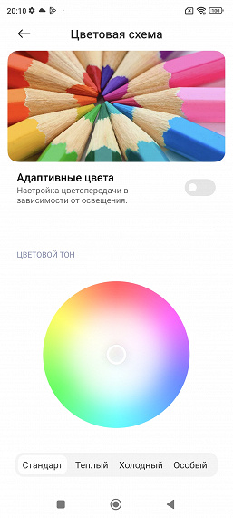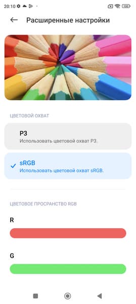 Фотография выше получена для профиля Яркие в настройках экрана. Базовых профилей три, а в четвертом можно вручную выбирать коррекцию цветового охвата, менять цветовой баланс многочисленными настройками и т. д.: