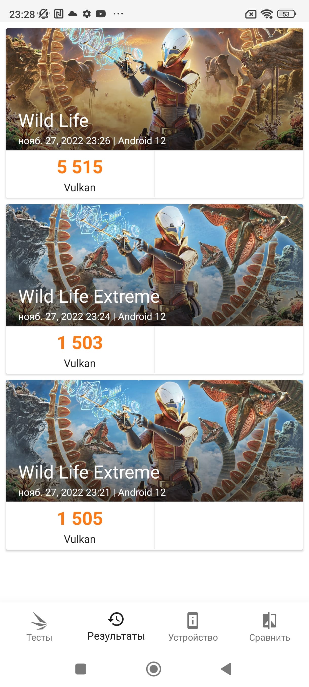 | 3DMark Wild Life Vulkan (больше — лучше) | 5515 | 8276 | 6642 | 4239 | 2322 |