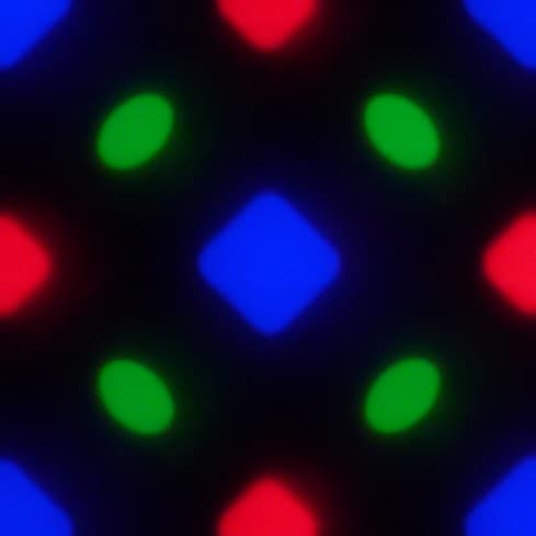 В этом экране используется матрица Super AMOLED — активная матрица на органических светодиодах. Полноцветное изображение создается с помощью субпикселей трех цветов — красного (R), зеленого (G) и синего (B), но красных и синих субпикселей в два раза меньше, что можно обозначить как RGBG. Это подтверждается фрагментом микрофотографии: