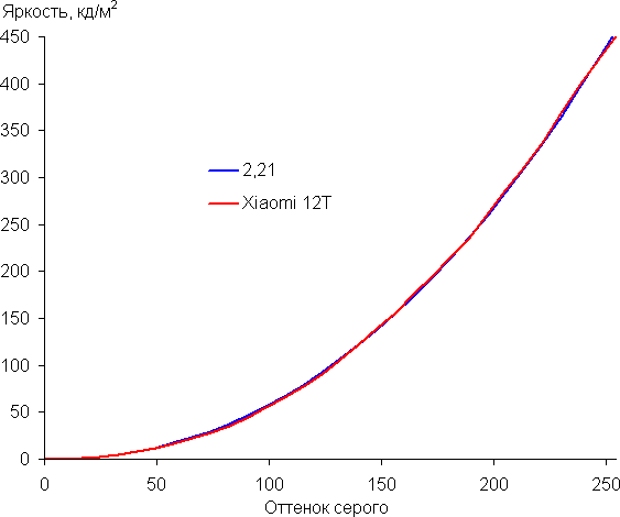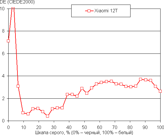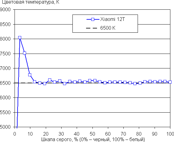 Цвета на экране Xiaomi 12T немного перенасыщены, а цветовой баланс заметно отличается. Напомним, что фотография не может служить надежным источником сведений о качестве цветопередачи и приводится только для условной наглядной иллюстрации. В частности, выраженный красноватый оттенок белого и серого полей, присутствующий на фотографиях экрана Xiaomi 12T, при перпендикулярном взгляде визуально отсутствует, что подтверждается аппаратными тестами с помощью спектрофотометра. Причина в том, что спектральная чувствительность матрицы фотоаппарата неточно совпадает с этой характеристикой человеческого зрения.