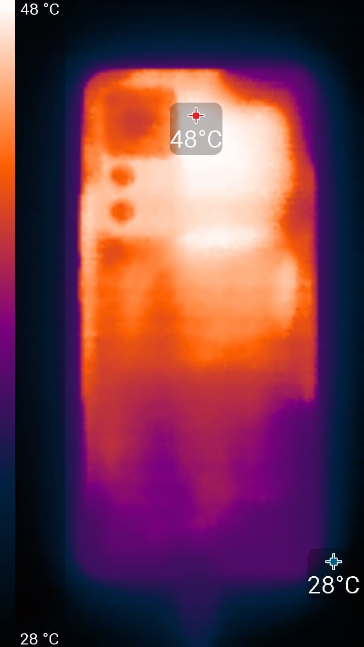 Нагрев больше в верхней части аппарата, что, видимо, соответствует расположению микросхемы SoC. По данным теплокамеры, максимальный нагрев составил 51 градус (при температуре окружающего воздуха в 24 градуса), это типичный нагрев в случае данного теста в сравнении с другими современными производительными смартфонами. Для более-менее точного определения температуры на заднюю поверхность смартфона пришлось наклеить кусок тонкой клейкой ленты, что увеличило коэффициент излучения поверхности до значения, близкого к единице. Без клейкой ленты температура, определенная с помощью теплокамеры, была занижена на три градуса.