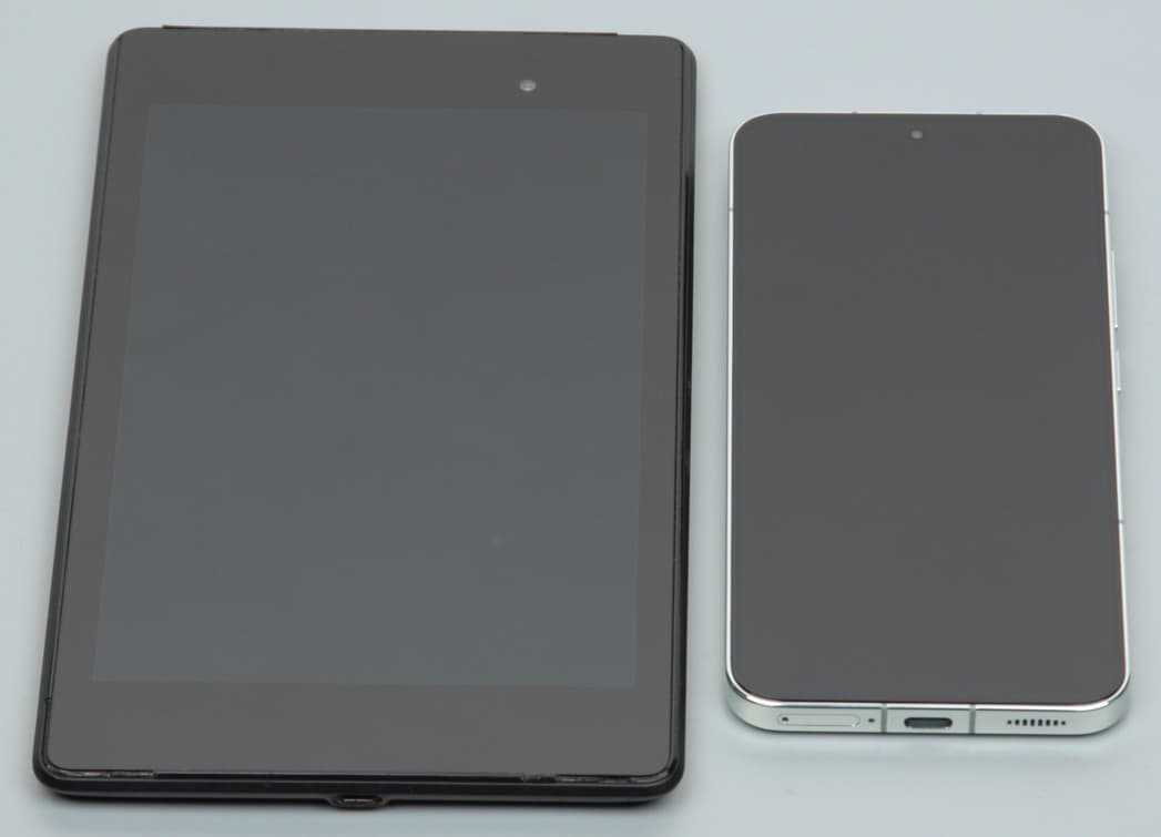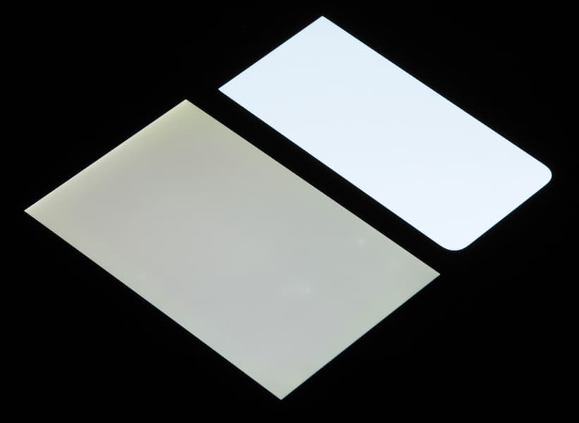 Лицевая поверхность экрана выполнена в виде стеклянной пластины с зеркально-гладкой поверхностью, устойчивой к появлению царапин. Судя по отражению объектов, антибликовые свойства экрана лучше, чем у экрана Google Nexus 7 (2013) (далее просто Nexus 7). Для наглядности приведем фотографию, на которой в выключенных экранах отражается белая поверхность (слева — Nexus 7, справа — Xiaomi 13, далее их можно различать по размеру):