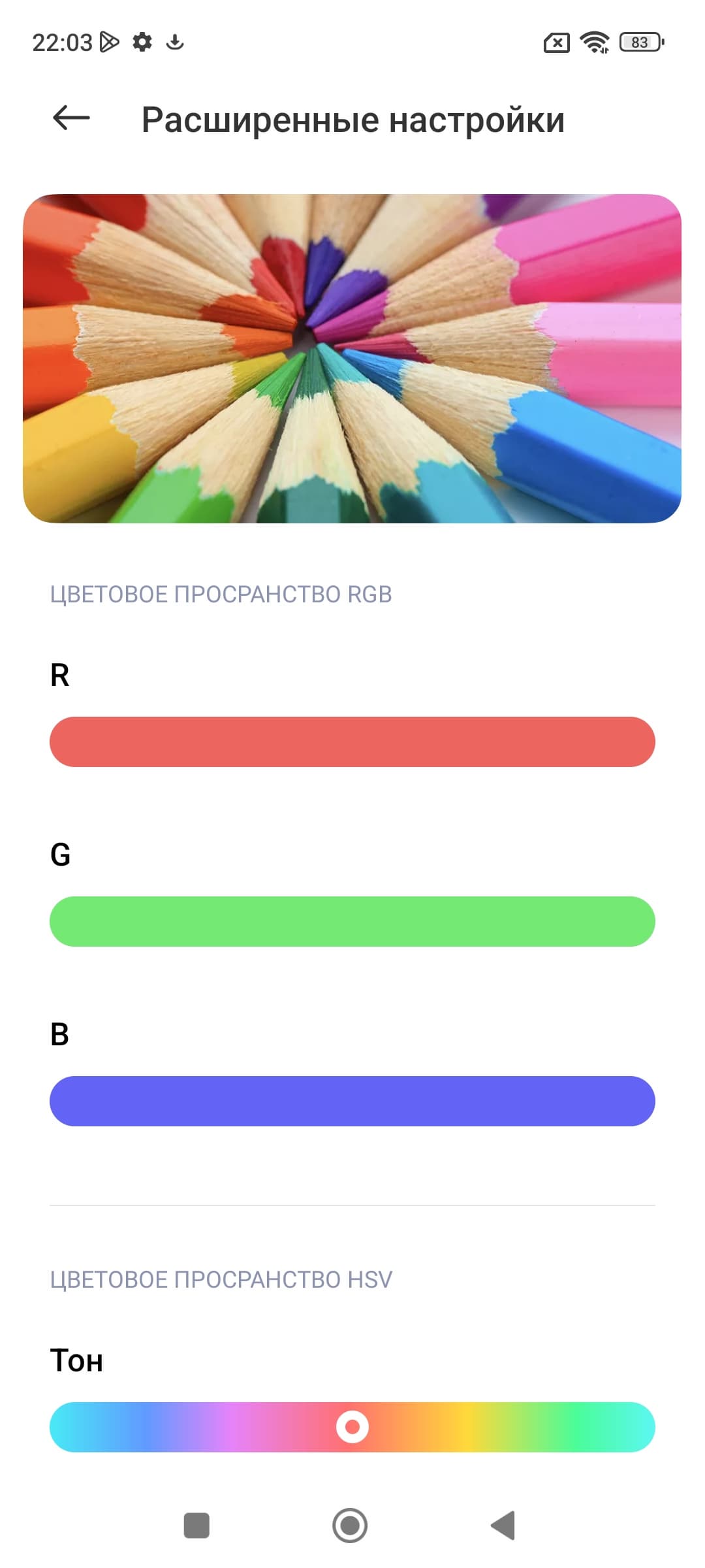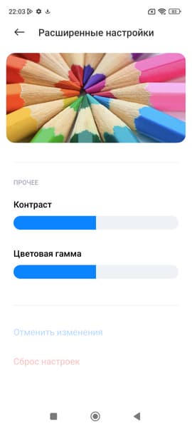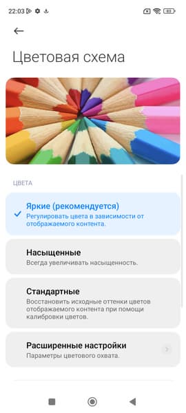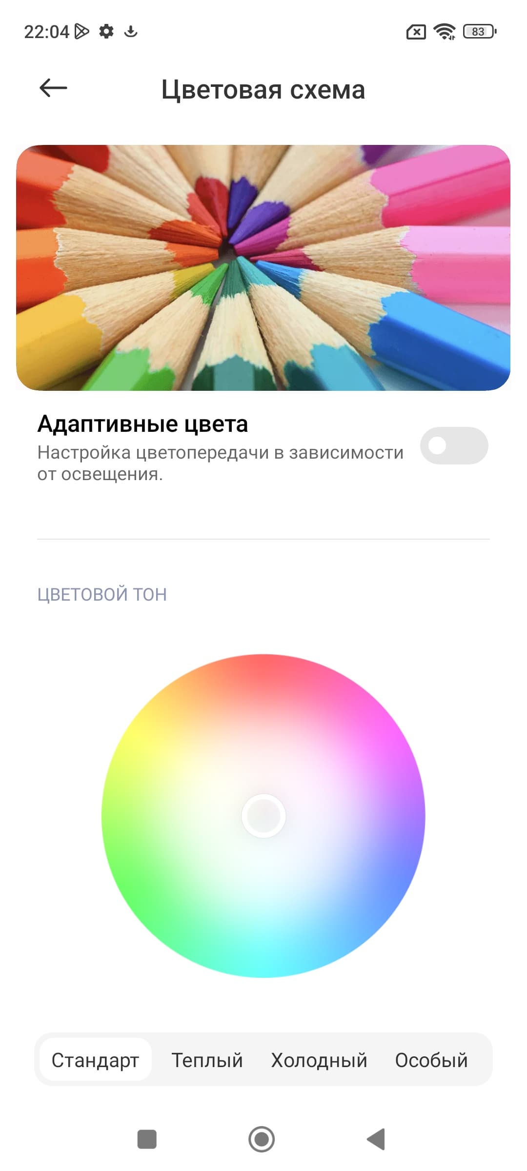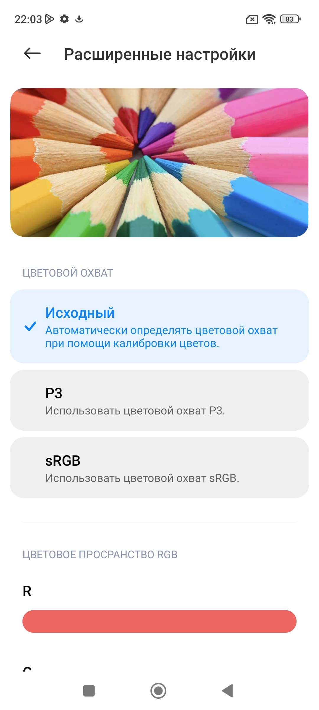 Фотография выше получена для профиля Яркие в настройках экрана. Базовых профилей три, а в четвертом можно вручную выбирать коррекцию цветового охвата, менять цветовой баланс многочисленными настройками и т. д.: