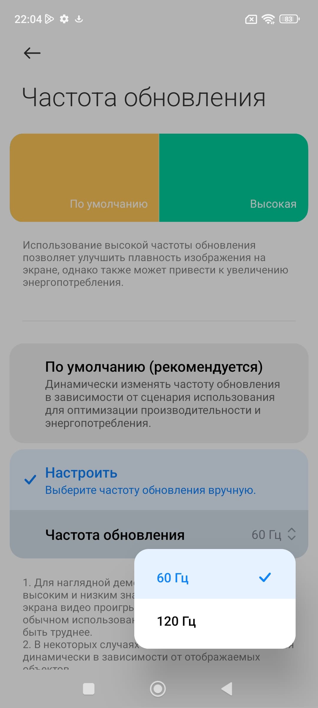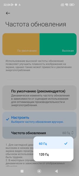 В настройках экрана можно включить режим с повышенной до 120 Гц частотой обновления: