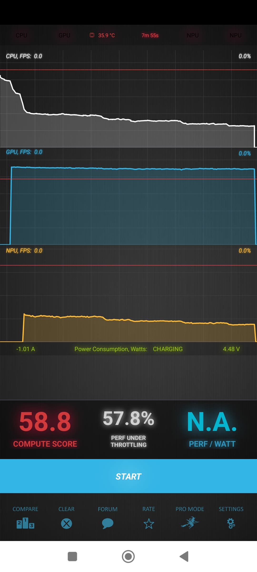 Тест на снижение производительности при нагреве мы проводим с помощью программы Burnout Benchmark, которая позволяет нагружать CPU, GPU и NPU: