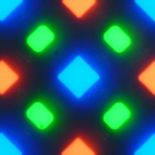 В этом экране используется матрица Super AMOLED — активная матрица на органических светодиодах. Полноцветное изображение создается с помощью субпикселей трех цветов — красного (R), зеленого (G) и синего (B), но красных и синих субпикселей в два раза меньше, что можно обозначить как RGBG. Это подтверждается фрагментом микрофотографии: