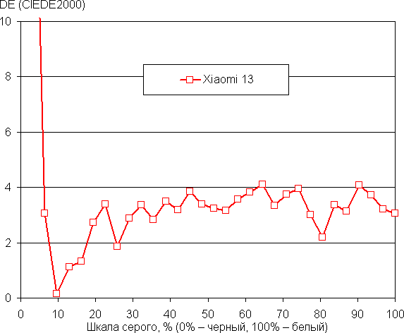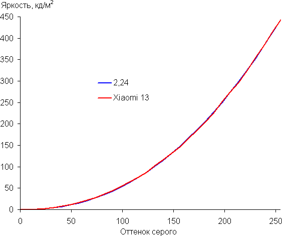 Напомним, что в случае OLED-экранов яркость фрагментов изображения динамично меняется в соответствии с характером выводимого изображения — немного уменьшается для светлых в целом изображений. В итоге полученная зависимость яркости от оттенка (гамма-кривая), скорее всего, не соответствует гамма-кривой статичного изображения, так как измерения проводились при последовательном выводе оттенков серого почти на весь экран.