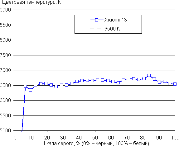 Цвета на экране Xiaomi 13 немного перенасыщены, а цветовой баланс заметно отличается. Напомним, что фотография не может служить надежным источником сведений о качестве цветопередачи и приводится только для условной наглядной иллюстрации. В частности, выраженный красноватый оттенок белого и серого полей, присутствующий на фотографиях экрана Xiaomi 13, при перпендикулярном взгляде визуально отсутствует, что подтверждается аппаратными тестами с помощью спектрофотометра. Причина в том, что спектральная чувствительность матрицы фотоаппарата неточно совпадает с этой характеристикой человеческого зрения.