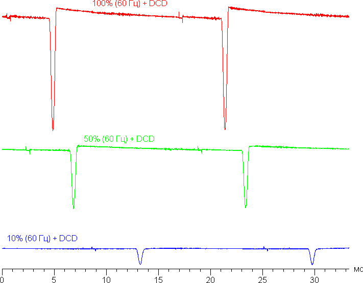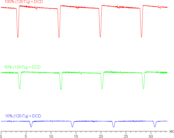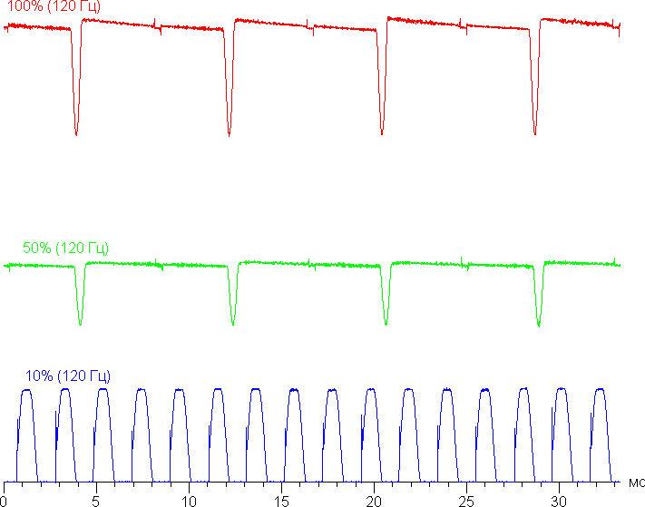 Видно, что на высокой и средней яркости частота модуляции увеличилась в 2 раза, а на низкой яркости характер модуляции не изменился. Отметим, что частота обновления 120 Гц устанавливается, только если на экран выводится динамическое изображение.
