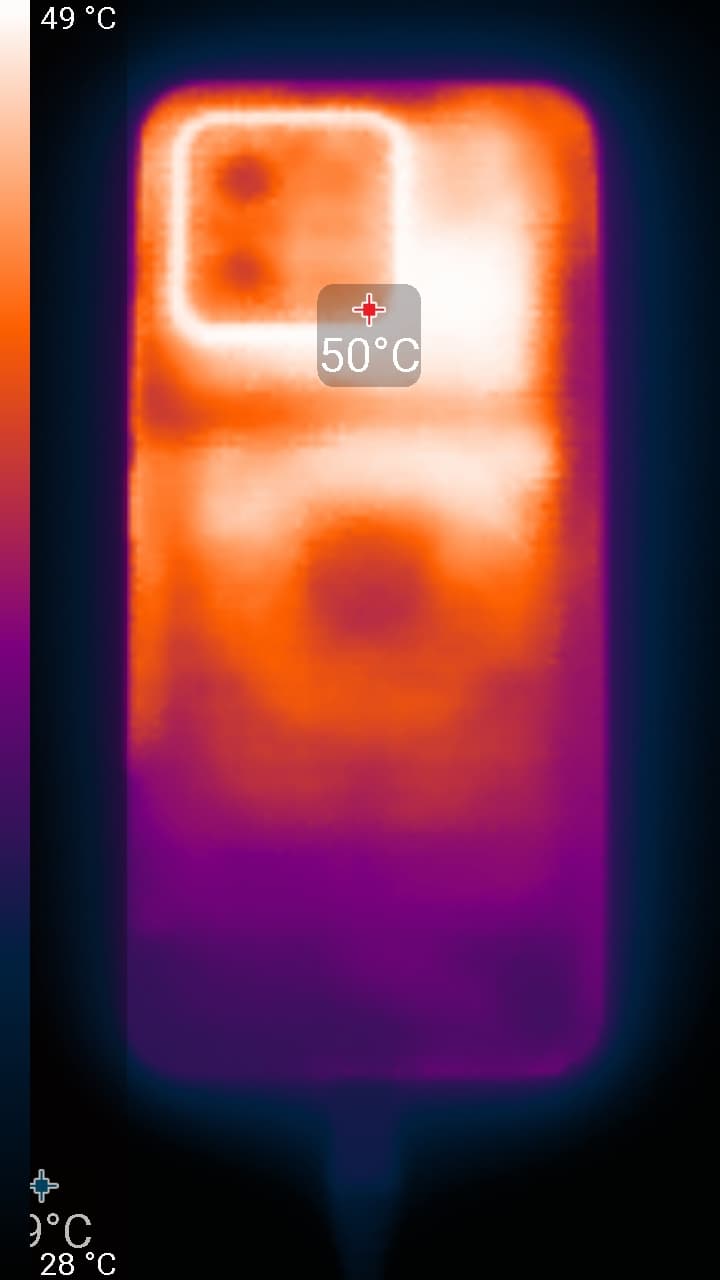 Нагрев больше в верхней части аппарата, что, видимо, соответствует расположению микросхемы SoC. По данным теплокамеры, максимальный нагрев составил 50 градусов (при температуре окружающего воздуха в 24 градуса). Формально это средний нагрев в случае данного теста в сравнении с другими современными смартфонами. Однако еще в процессе стресс-теста смартфон сообщил о перегреве.
