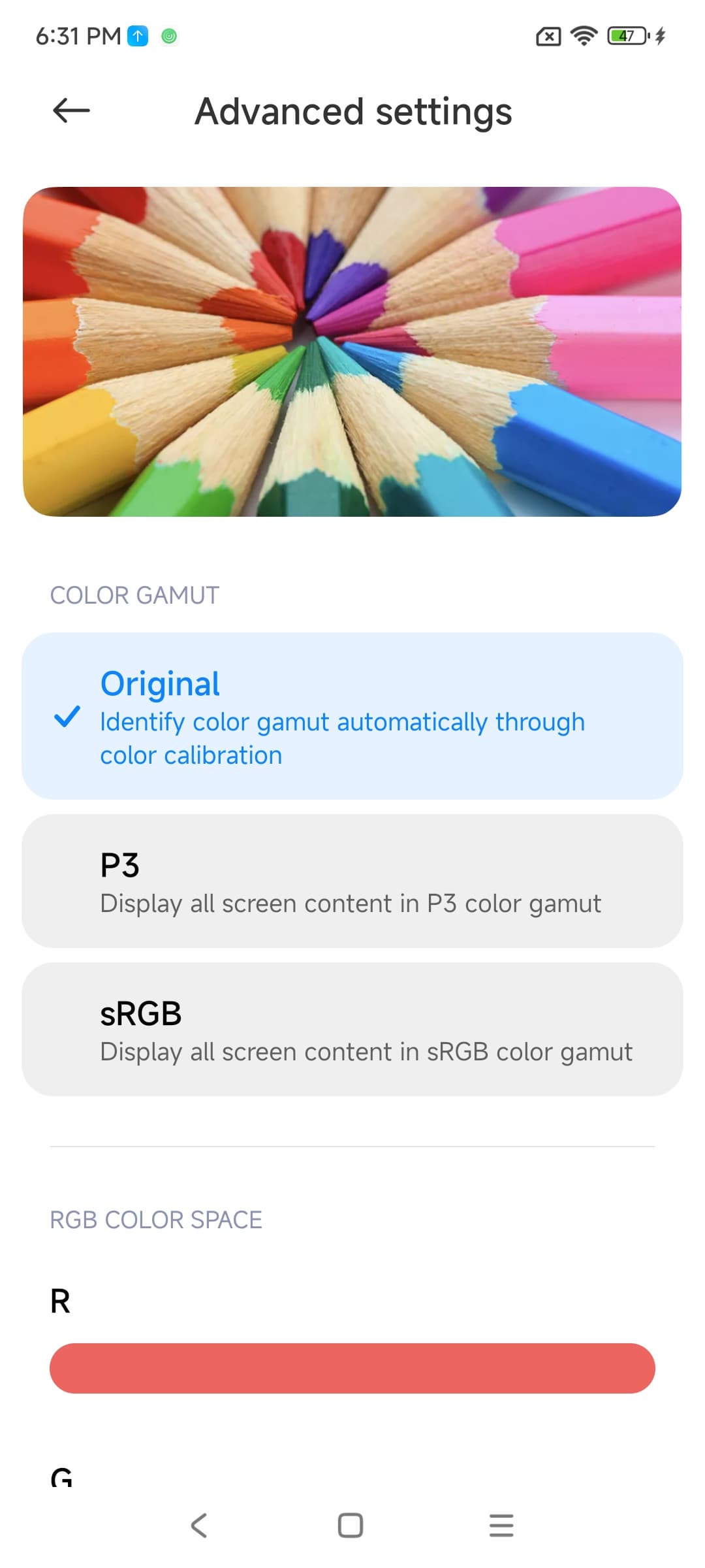 Такое обилие настроек, часть из которых делает одно и тоже, только немного разными путями, свидетельствует о том, что производитель абсолютно не понимает, что же пользователю нужно, и в тщетной попытке угодить всем, бездумно копирует решения конкурентов и плодит количество настроек. По факту ценность имеют два профиля — это Original на вкладке Advanced settings, в котором цветовой охват близок к sRGB, а цветовой баланс близок к стандартному, и P3 с цветовым охватом DCI-P3.