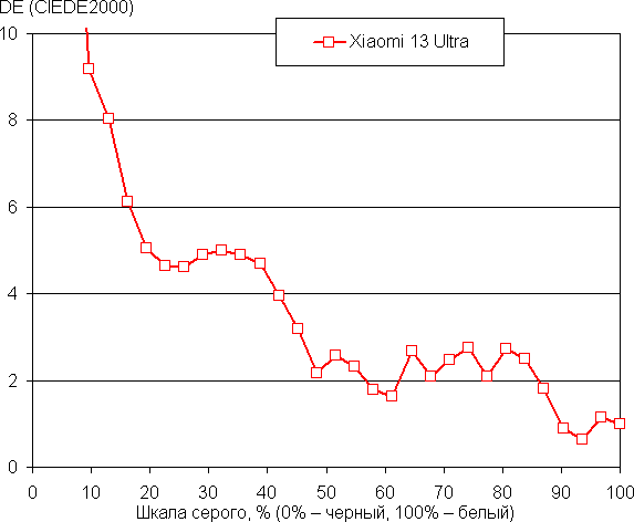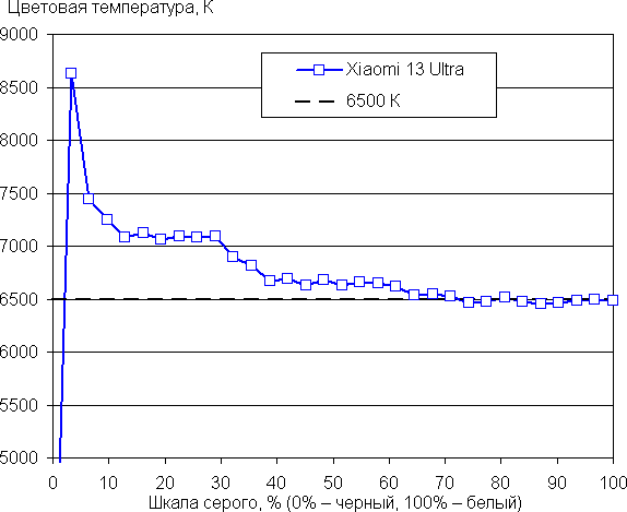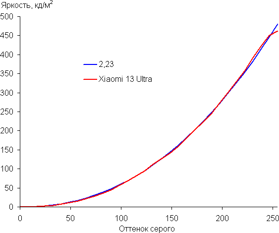 Напомним, что в случае OLED-экранов яркость фрагментов изображения динамично меняется в соответствии с характером выводимого изображения — немного уменьшается для светлых в целом изображений. В итоге полученная зависимость яркости от оттенка (гамма-кривая), скорее всего, не соответствует гамма-кривой статичного изображения, так как измерения проводились при последовательном выводе оттенков серого почти на весь экран.