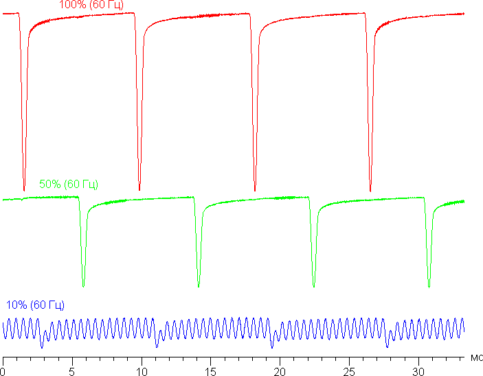 На высоком и среднем уровне яркости присутствует значимая модуляция с частотой примерно 120 Гц. На рисунке ниже приведены зависимости яркости (вертикальная ось) от времени (горизонтальная ось) для нескольких значений настройки яркости. Режим с частотой обновления 60 Гц: