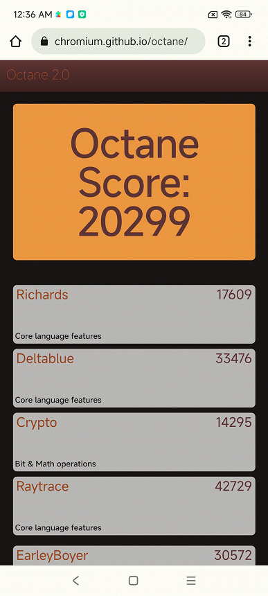 | Google Octane 2 (больше — лучше) | 20299 | 53298 | 59248 | 30430 | 54735 |