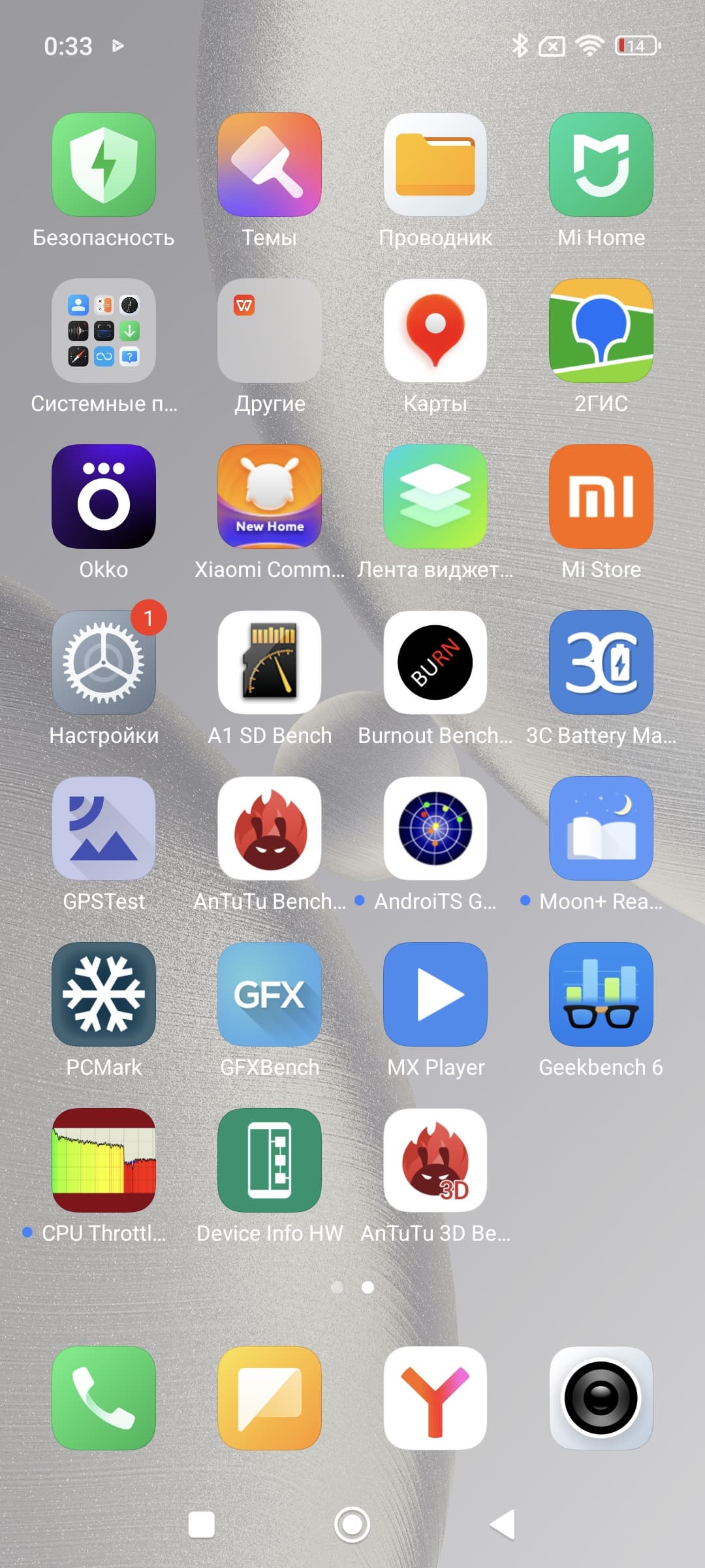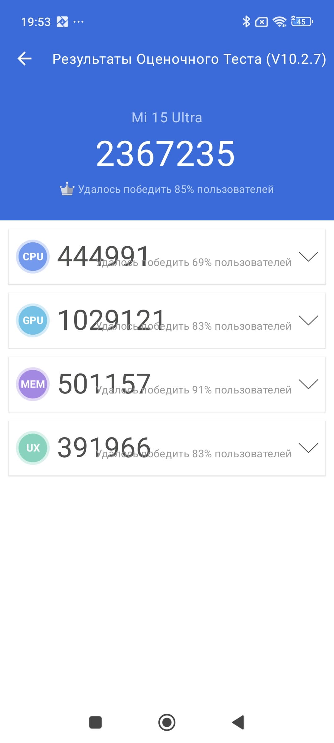 | AnTuTu (v10.x) (больше — лучше) | 2367235 | 1249560 | 2128115 | 1248642 | 1379644 |