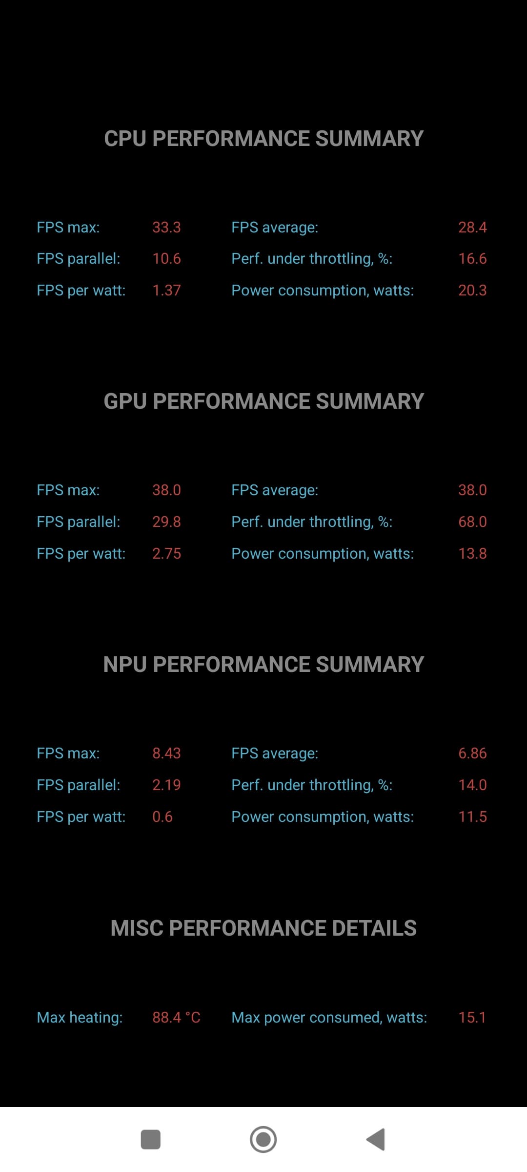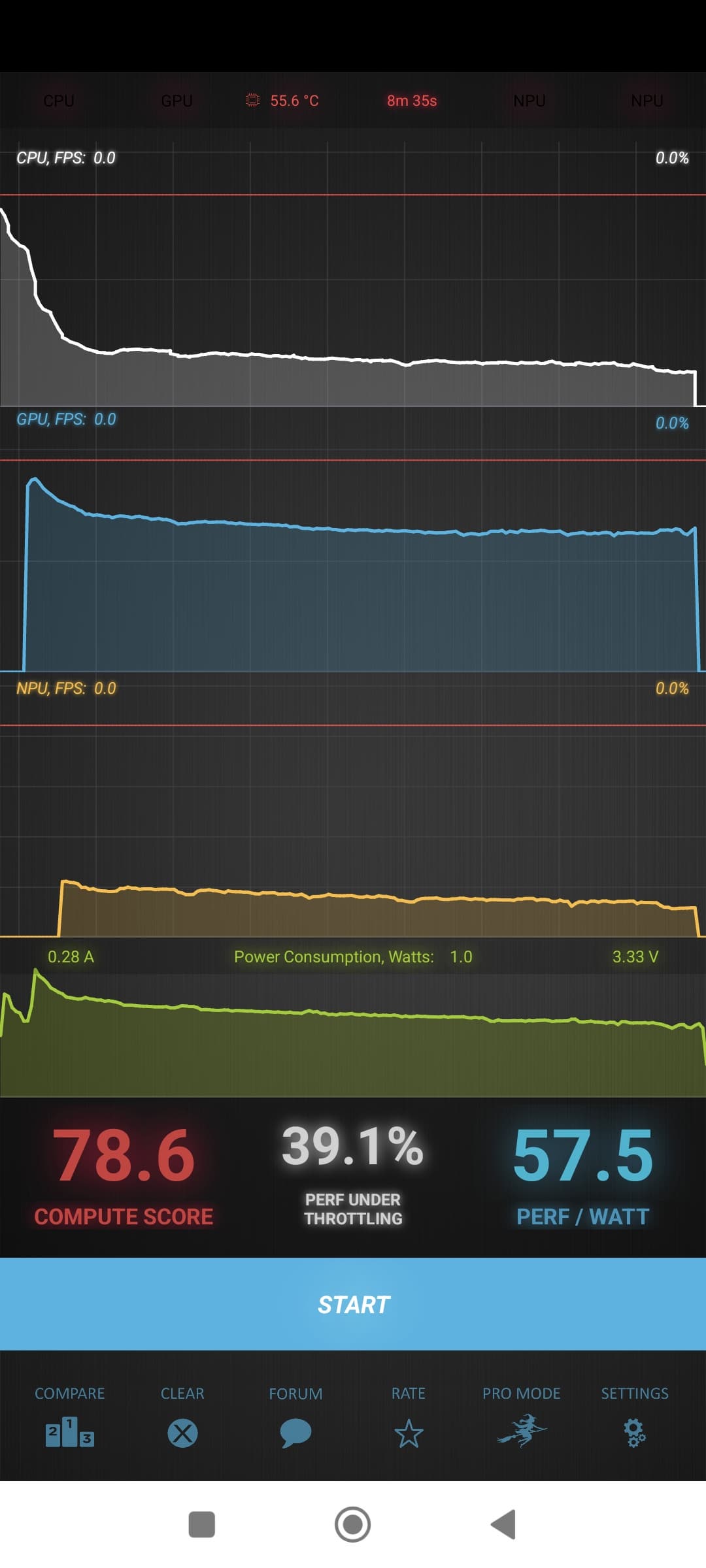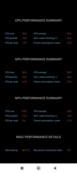 Тест на снижение производительности при нагреве мы проводим с помощью программы Burnout Benchmark, которая позволяет нагружать CPU, GPU и NPU. Хорошо видно, что GPU тротлится слабо, а именно в его случае это важный показатель.