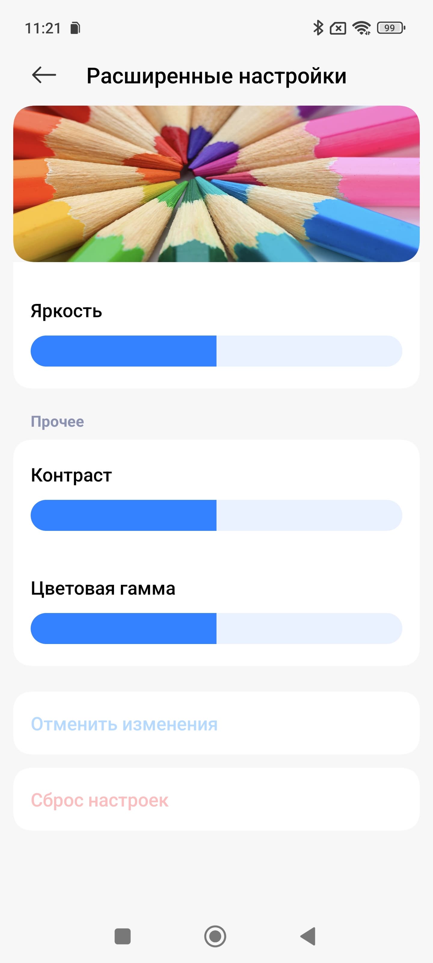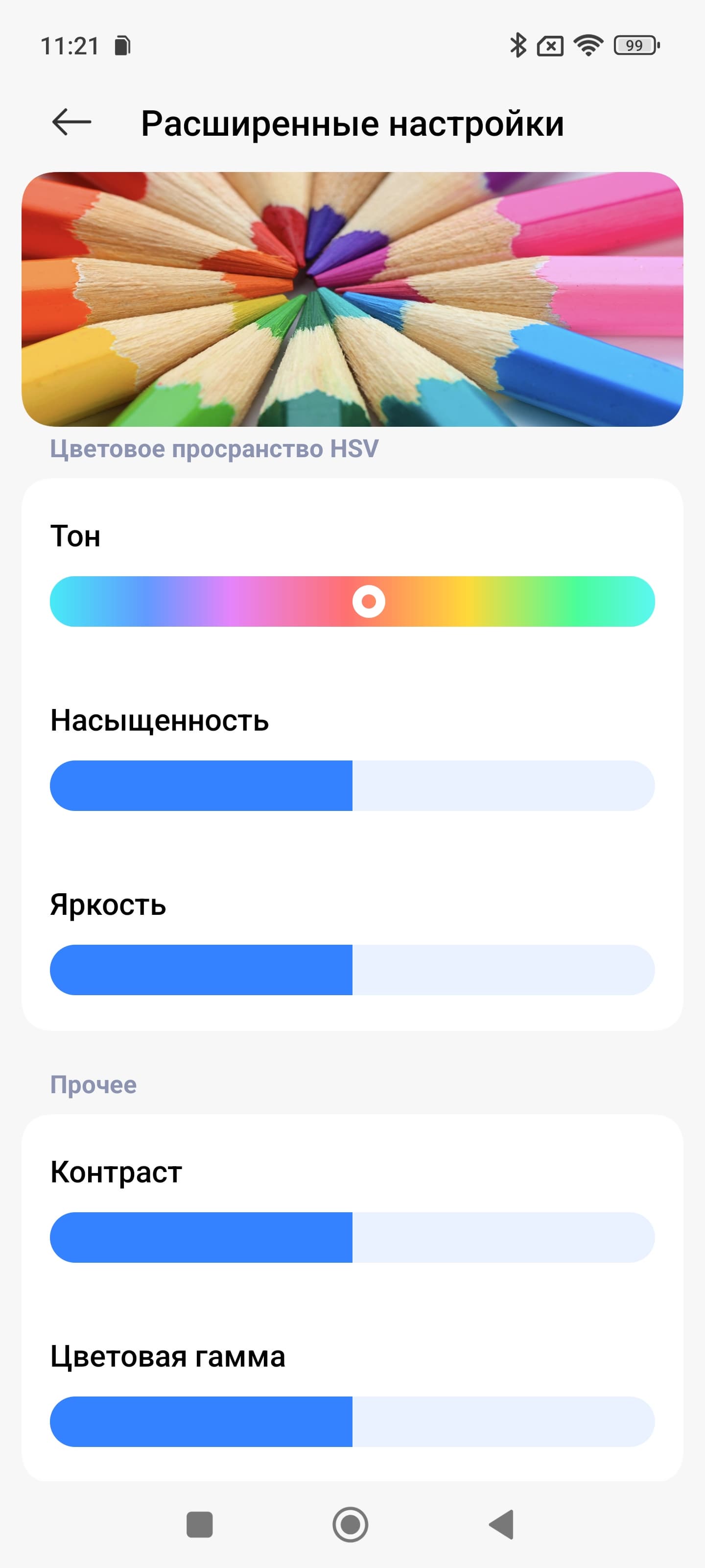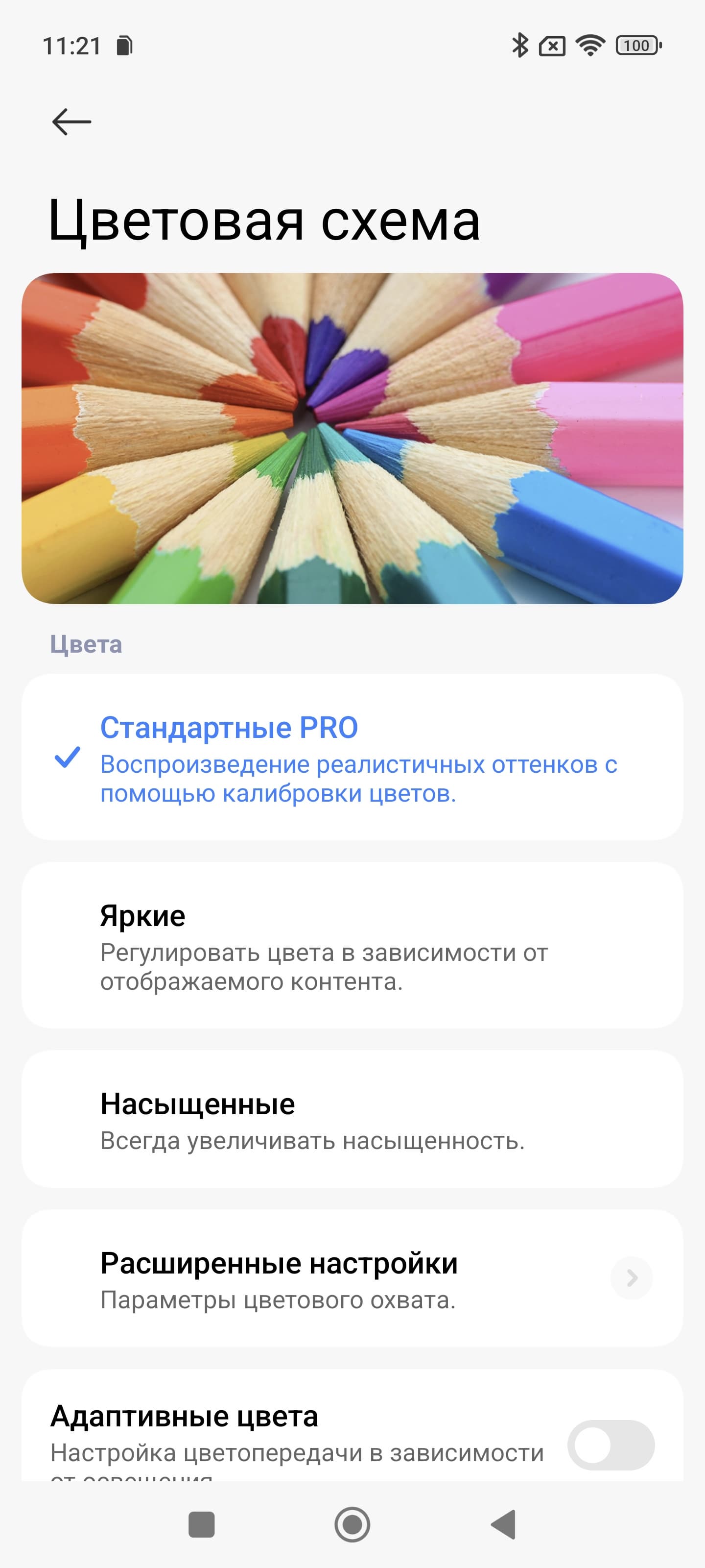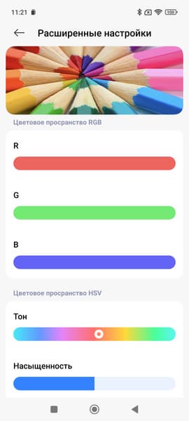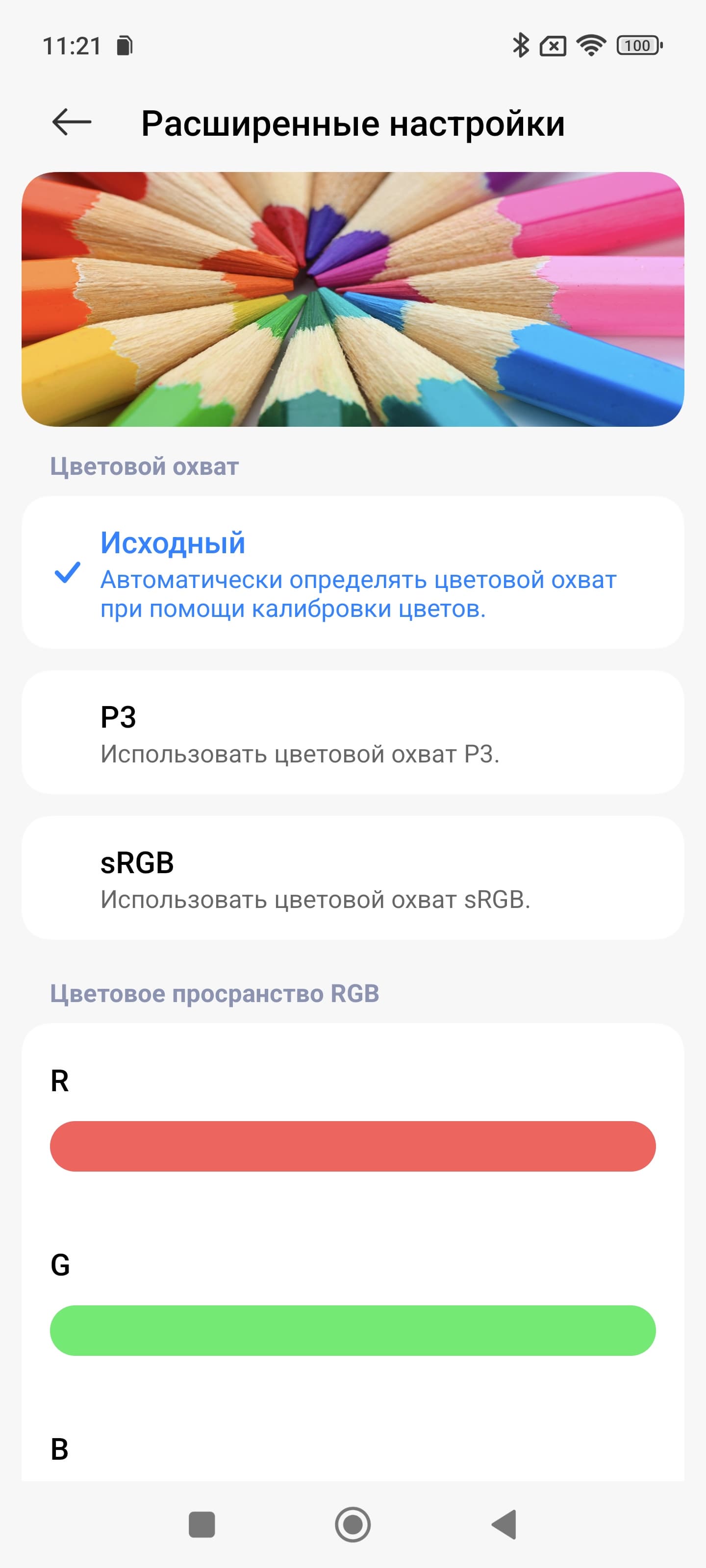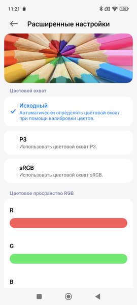 Таким образом профиль Насыщенные — принудительное расширение цветового охват до максимального, Яркие или P3 — коррекция до охвата DCI-P3, sRGB — коррекция до sRGB. Стандартные Pro или Исходный — коррекция (по возможности) охвата до прописанного профиля в изображении при выводе в программе Галерея, а в сторонних программах — вывод в sRGB. При этом только в случае профиля Исходный цветовой баланс по умолчанию максимально близок к стандартному.