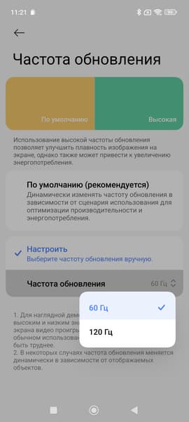 В режиме 120 Гц плавность прокрутки (списков в меню и т.д.) заметно повышается. Характер модуляции при этом не меняется, видимое мерцание отсутствует. По факту режим всегда динамичный и, если не касаться экрана, то частота обновления может снижаться до 1 Гц (по данным мониторинга). Данной настройкой пользователь ограничивает только максимальную частоту обновления.