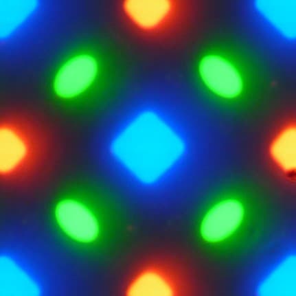 В этом экране используется матрица OLED — активная матрица на органических светодиодах. Полноцветное изображение создается с помощью субпикселей трех цветов — красного (R), зеленого (G) и синего (B), но красных и синих субпикселей в два раза меньше, что можно обозначить как RGBG. Это подтверждается фрагментом микрофотографии: