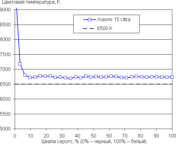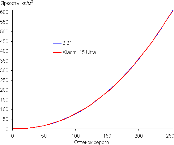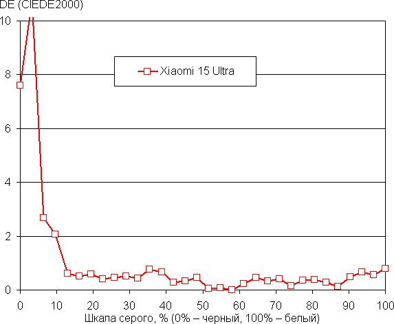 Напомним, что в случае OLED-экранов яркость фрагментов изображения динамично меняется в соответствии с характером выводимого изображения — немного уменьшается для светлых в целом изображений. В итоге полученная зависимость яркости от оттенка (гамма-кривая), скорее всего, не соответствует гамма-кривой статичного изображения, так как измерения проводились при последовательном выводе оттенков серого почти на весь экран.