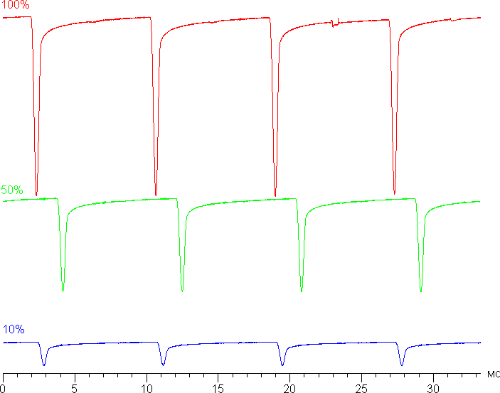 На любом уровне яркости присутствует значимая модуляция с частотой 120 Гц. На рисунке ниже приведены зависимости яркости (вертикальная ось) от времени (горизонтальная ось) для нескольких значений настройки яркости. Режим с частотой обновления 60 Гц: