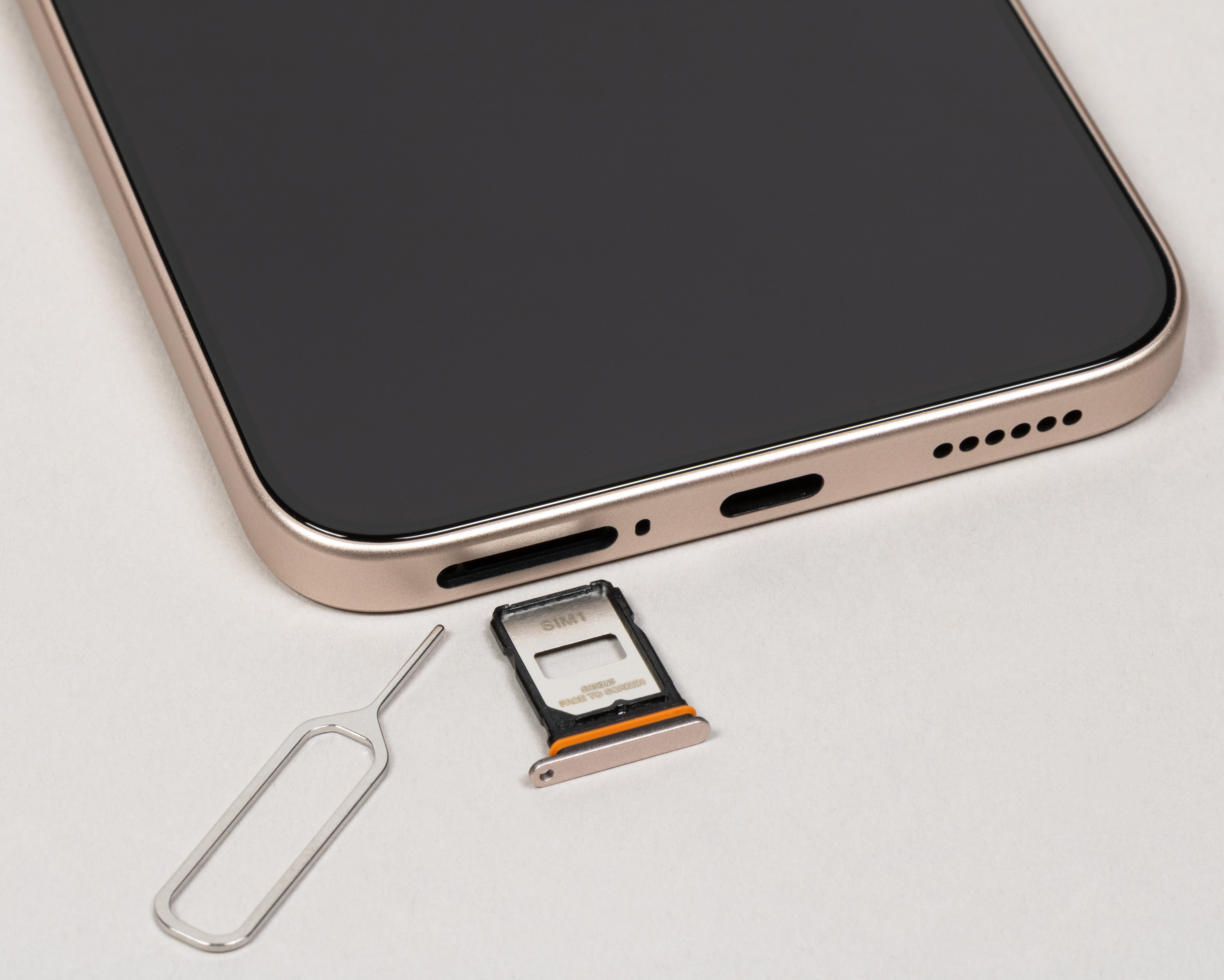 На торце снизу установлены динамик, разъем USB Type-C и микрофон. В выдвижной лоток можно установить карты Nano-SIM, для карты памяти microSD места нет.