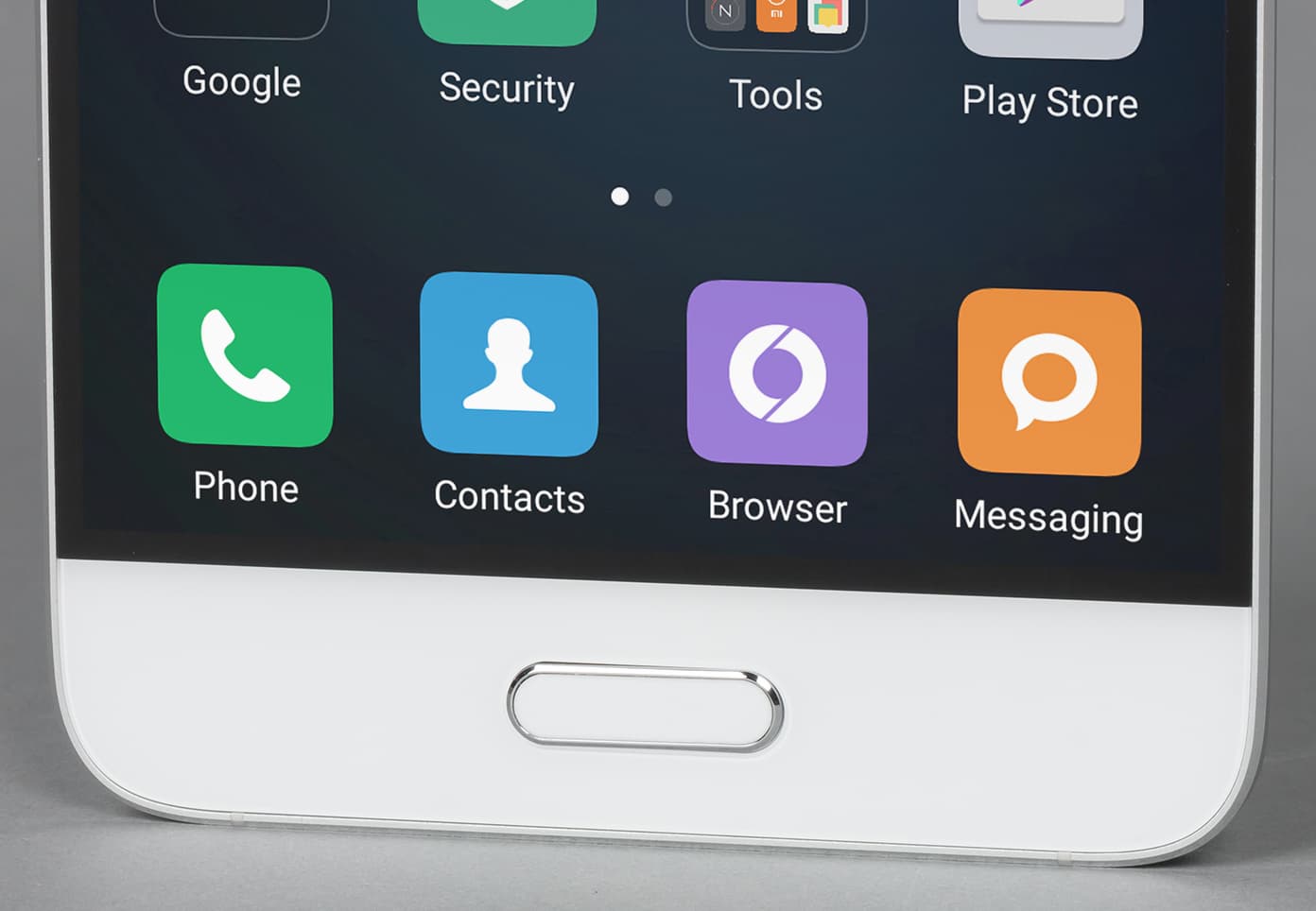 В нижней части передней панели установлена овальная механическая клавиша со вписанной в нее площадкой дактилоскопического сенсора. Сенсор мгновенно и практически безошибочно распознает отпечатки пальцев владельца, но, вопреки слухам насчет применения ультразвуковой технологии Qualcomm 3D Ultrasonic, проводить сканирование сквозь перчатки он не способен. Две соседние управляющие кнопки обозначены точками и имеют собственную подсветку белого цвета.