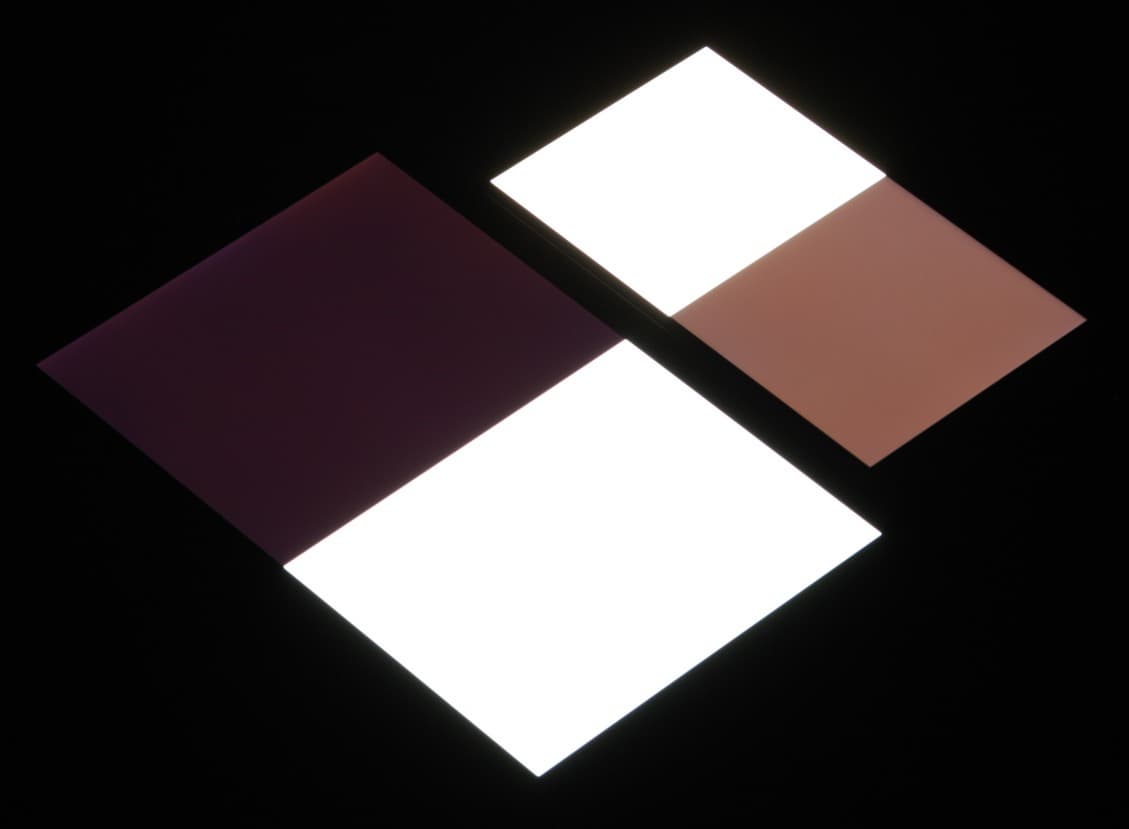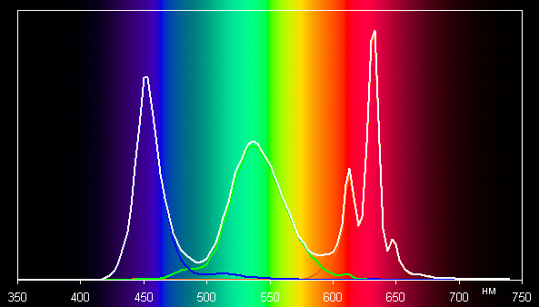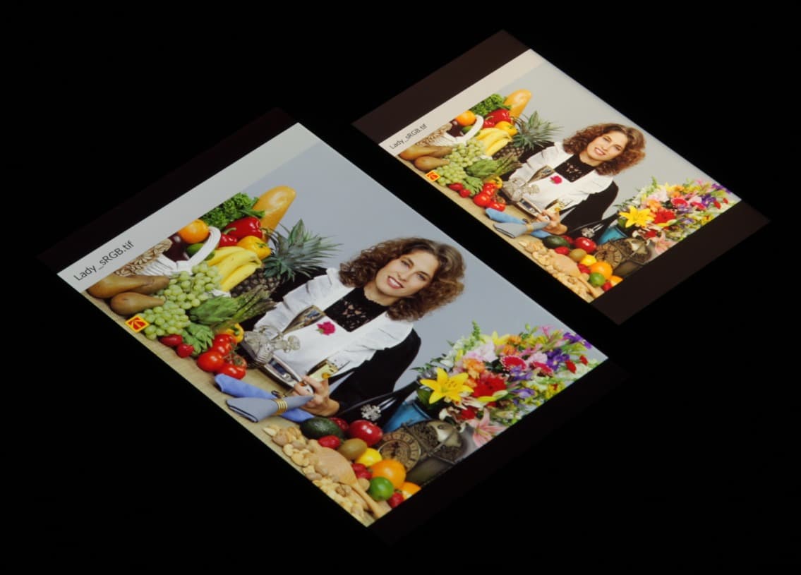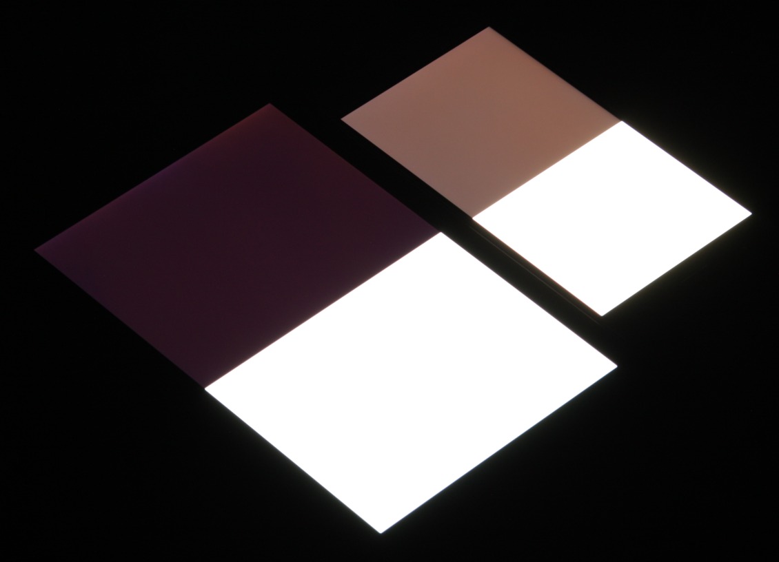 Такие спектры (к сожалению) встречаются в топовых мобильных устройствах Sony и других производителей. По всей видимости, в этом экране используются светодиоды с синим излучателем и зеленым и красным люминофором (обычно — синий излучатель и желтый люминофор), что в сочетании со специальными светофильтрами матрицы и позволяет получить широкий цветовой охват. Да, и в красном люминофоре, видимо, используются так называемые квантовые точки. Для потребительского устройства широкий цветовой охват является никак не достоинством, а существенным недостатком, так как в итоге цвета изображений — рисунков, фотографий и фильмов, — ориентированных на пространство sRGB (а таких подавляющее большинство), имеют неестественную насыщенность. Особенно это заметно на узнаваемых оттенках, например на оттенках кожи. Результат приведен на фотографии выше.