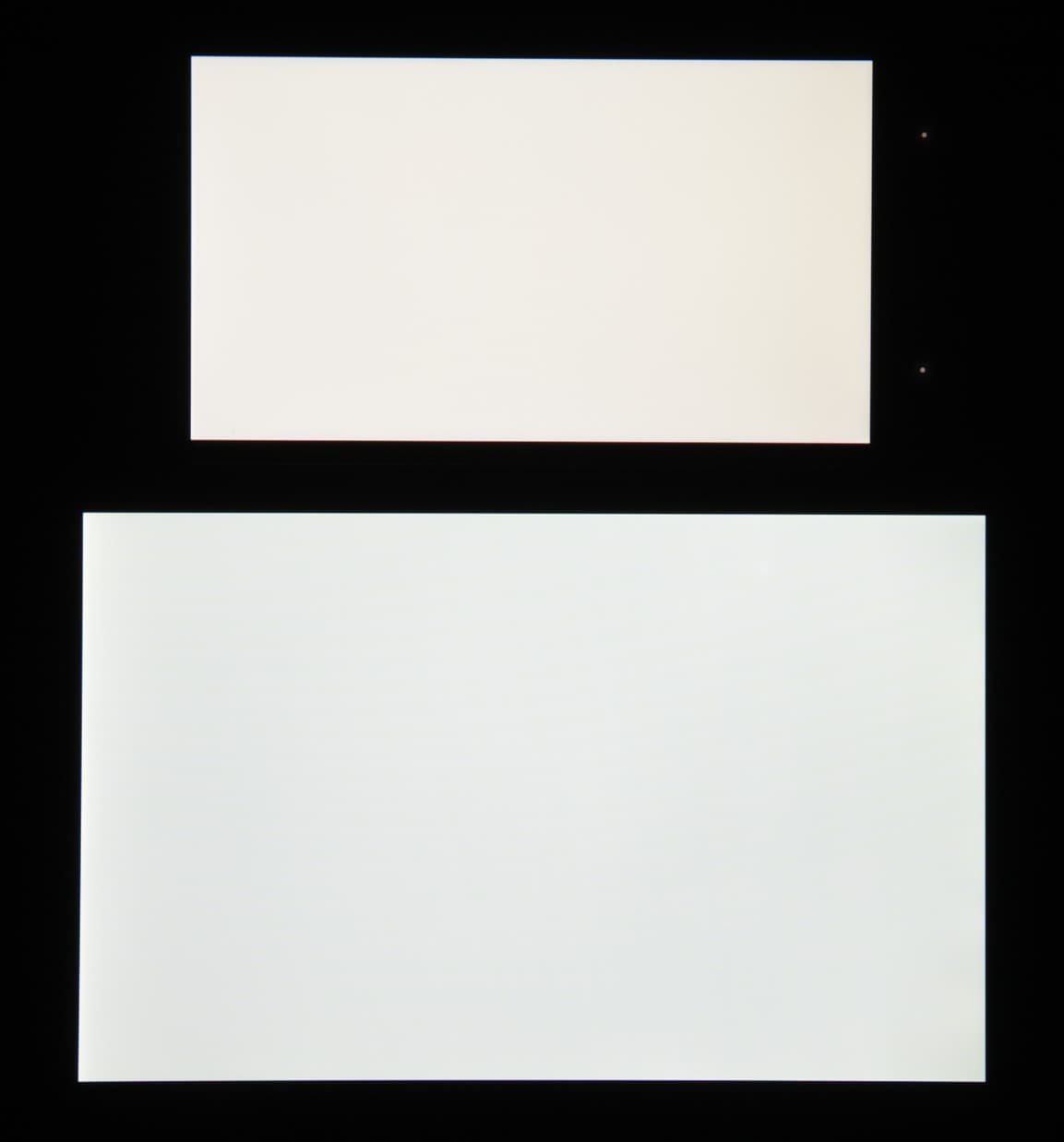 Яркость под углом у экранов уменьшилась (как минимум в 4 раза, исходя из разницы в выдержке), но у Xiaomi Mi 5 экран при этом светлее (яркость по фотографиям 242 против 223 у Nexus 7). Черное поле при отклонении по диагонали высветляется сильно и приобретает красноватый оттенок. Фотографии ниже это демонстрируют (яркость белых участков в перпендикулярном плоскости экранов направлении одинаковая!):