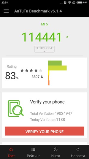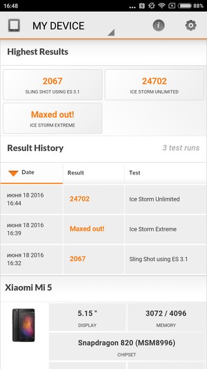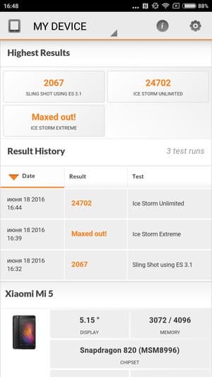 Емкость несъемной батареи, установленной в Xiaomi Mi 5, составляет 3000 мА·ч. Это довольно внушительная цифра, учитывая некрупный, тонкий, а главное — очень легкий корпус смартфона. Трудно сказать по первому знакомству с новой платформой Qualcomm Snapdragon 820, ее ли нужно благодарить за высочайший уровень автономности, продемонстрированный Xiaomi Mi 5, или что-то другое. Но факт остается фактом: мощнейший и производительный смартфон, довольно-таки ощутимо нагревающийся при выполнении требовательных задач, демонстрирует, тем не менее, чрезвычайно высокий уровень автономной работы. Это не рекорд, конечно, но даже на фоне самых современных флагманов герой обзора выглядит более чем достойно.