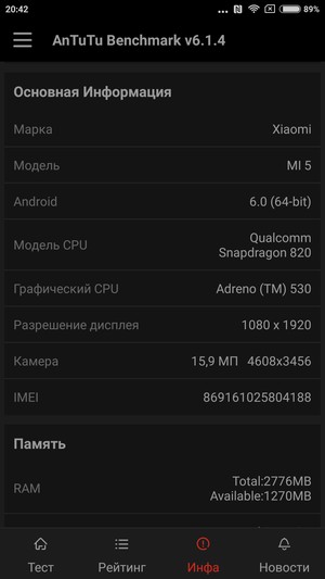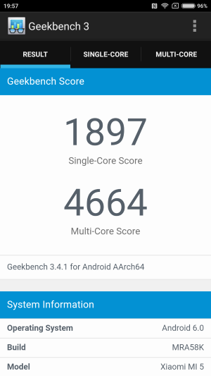 Аппаратная платформа Xiaomi Mi 5 строится на базе новой и самой мощной из ныне присутствующих на рынке мобильных платформ Qualcomm — 4-ядерной SoC Qualcomm Snapdragon 820. Согласно официальным данным Qualcomm, CPU и GPU данной платформы на 100% и 40% быстрее CPU и GPU Snapdragon 810 соответственно (подробнее о новой платформе можно прочитать в нашем отдельном материале). Конфигурация Snapdragon 820 включает четыре 64-разрядных процессорных ядра Kryo (ARMv8), которые являются собственной разработкой Qualcomm. Максимальная частота процессорных ядер в версиях Xiaomi Mi 5 с 4 ГБ ОЗУ составляет 2,2 ГГц, но здесь она снижена до 1,8 ГГц. За обработку графики отвечает новый GPU Adreno 530 с поддержкой OpenGL ES 3.1+. В данной модели установлено 3 ГБ оперативной памяти LPDDR4 (из них изначально свободно 1,9 ГБ) и 32 флэш-памяти UFS, но также доступны разновидности Xiaomi Mi 5 с 4 ГБ ОЗУ и 64 или 128 ГБ флэш-памяти. Установка карт microSD вообще не предусмотрена. Поддерживается подключение сторонних флэш-накопителей в режиме USB OTG, но для этого придется обзавестись OTG-переходником под разъем USB Type С.