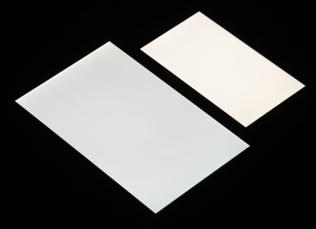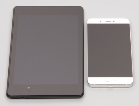 Лицевая поверхность экрана выполнена в виде стеклянной пластины с зеркально-гладкой поверхностью, устойчивой к появлению царапин. Судя по отражению объектов антибликовые свойства экрана лучше, чем у экрана Google Nexus 7 (2013) (далее просто Nexus 7). Для наглядности приведем фотографию, на которой в выключенных экранах отражается белая поверхность (слева — Nexus 7, справа — Xiaomi Mi 5, далее их можно различать по размеру):