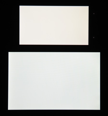 Экран имеет хорошие углы обзора без значительного сдвига цветов даже при больших отклонениях взгляда от перпендикуляра к экрану и без инвертирования оттенков. Для сравнения приведем фотографии, на которых на экраны Xiaomi Mi 5 и Nexus 7 выведены одинаковые изображения, при этом яркость экранов изначально установлена примерно на 200 кд/м², а цветовой баланс на фотоаппарате принудительно переключен на 6500 К. Перпендикулярно к экранам белое поле: