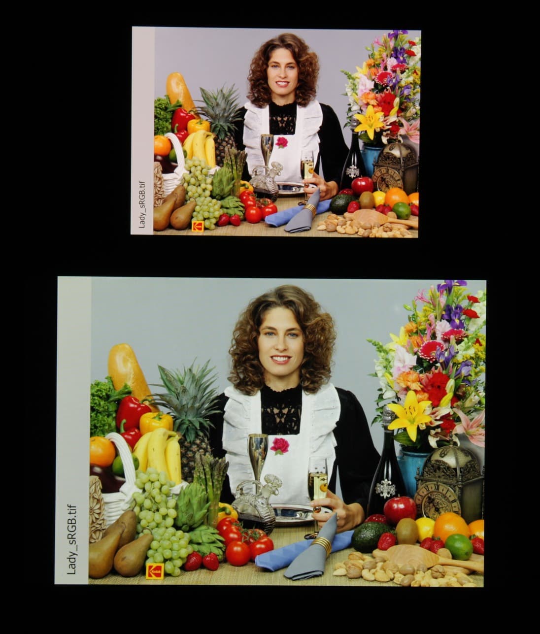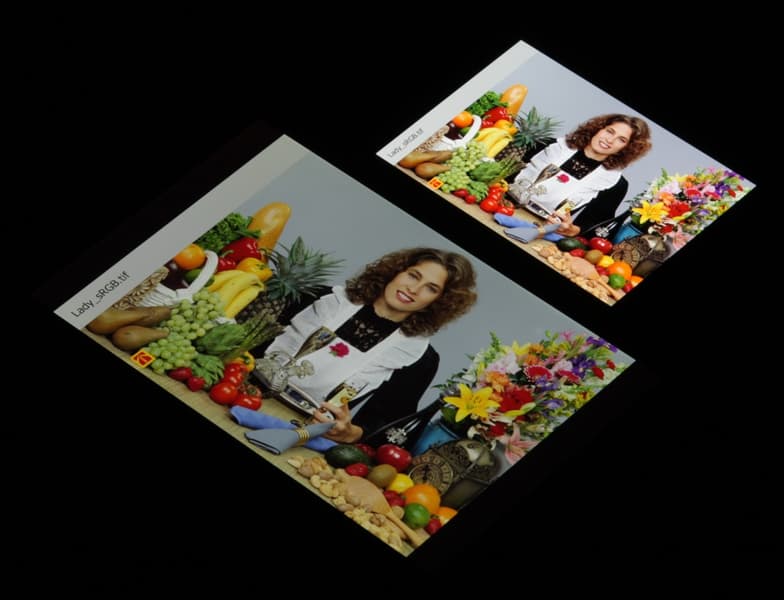 Цвета на экране Xiaomi Mi 9 SE перенасыщены (обратите внимание на помидоры, бананы, салфетку и оттенок лица), а цветовой баланс немного отличается. Напомним, что фотография не может служить надежным источником сведений о качестве цветопередачи и приводится только для условной наглядной иллюстрации. В частности, выраженный красноватый оттенок белого и серого полей, присутствующий на фотографиях экрана Xiaomi Mi 9 SE, при перпендикулярном взгляде визуально отсутствует, что подтверждается аппаратными тестами с помощью спектрофотометра. Причина в том, что спектральная чувствительность матрицы фотоаппарата неточно совпадает с этой характеристикой человеческого зрения.