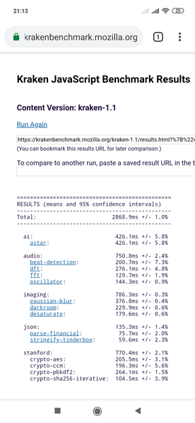 | Mozilla Kraken (мс, меньше — лучше) | 2869 | 2216 | 2034 | 3837 | 2859 |