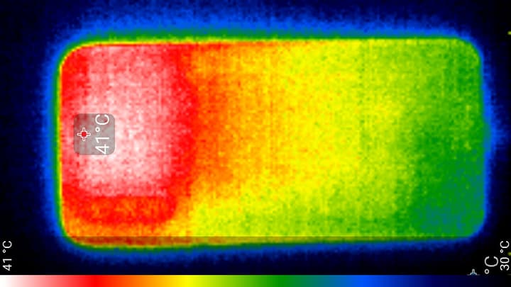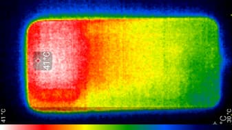 Нагрев больше в верхней части аппарата, что, видимо, соответствует расположению микросхемы SoC. По данным теплокамеры, максимальный нагрев составил 41 градус (при температуре окружающего воздуха в 24 градуса), это средний нагрев в данном тесте для современных смартфонов.