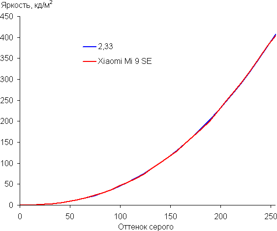 Напомним, что в случае OLED-экранов яркость фрагментов изображения динамично меняется в соответствии с характером выводимого изображения — уменьшается для светлых в целом изображений. В итоге полученная зависимость яркости от оттенка (гамма-кривая), скорее всего, немного не соответствует гамма-кривой статичного изображения, так как измерения проводились при последовательном выводе оттенков серого почти на весь экран.