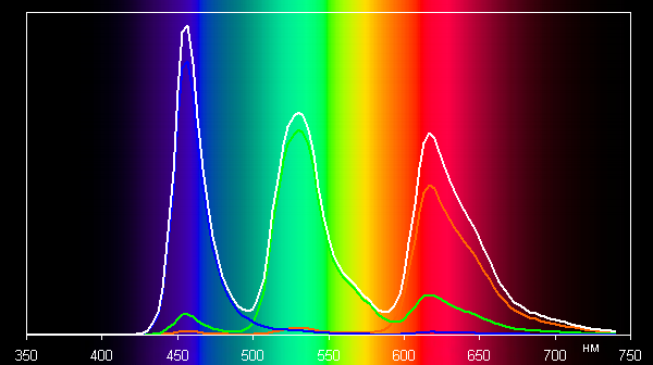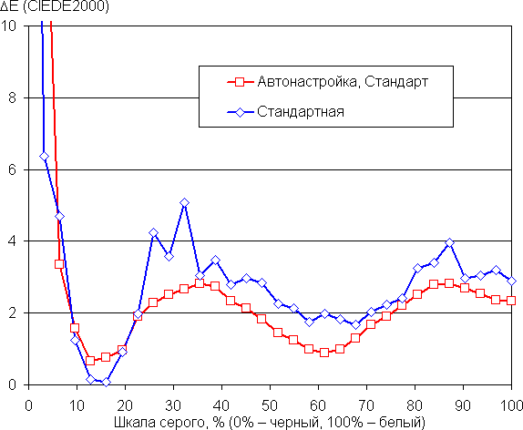 В этом устройстве есть возможность скорректировать цветовой баланс с помощью регулировки оттенка точкой на цветовом круге, но именно в правильном профиле Стандартная эта настройка неактивна. Впрочем, как для этого профиля, так и для профиля Автонастройка после выбора варианта Теплый баланс оттенков на шкале серого хороший, поскольку цветовая температура несильно выше стандартных 6500 К, а отклонение от спектра абсолютно черного тела (ΔE) ниже 10, что для потребительского устройства считается неплохим показателем. При этом цветовая температура мало изменяется от оттенка к оттенку — это положительно сказывается на визуальной оценке цветового баланса. По умолчанию выбран профиль Стандарт, в котором цветовая температура выше, но не критично. (Самые темные области шкалы серого можно не учитывать, так как там баланс цветов не имеет большого значения, да и погрешность измерений цветовых характеристик на низкой яркости большая.)