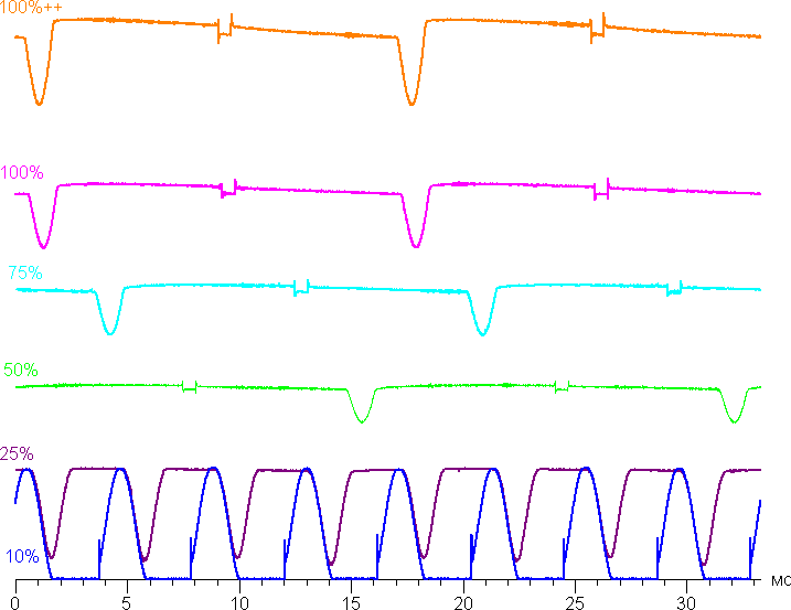 На любом уровне яркости присутствует значимая модуляция с частотой 60 или 240 Гц. На рисунке ниже приведены зависимости яркости (вертикальная ось) от времени (горизонтальная ось) для нескольких значений настройки яркости (100%++ — это с дополнительной засветкой датчика освещенности ярким светом):