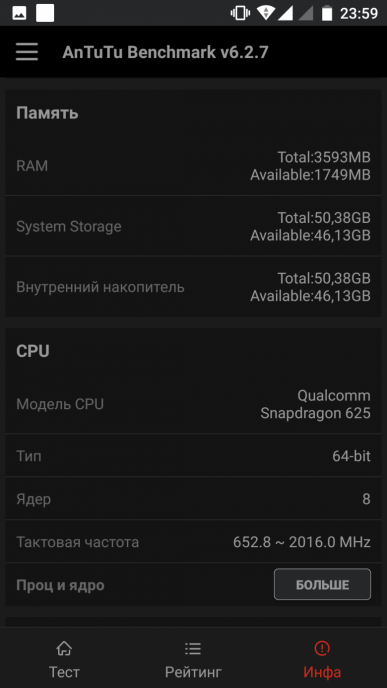 - SoC Qualcomm Snapdragon 625, 8 ядер ARM Cortex-A53 @2,0 ГГц
