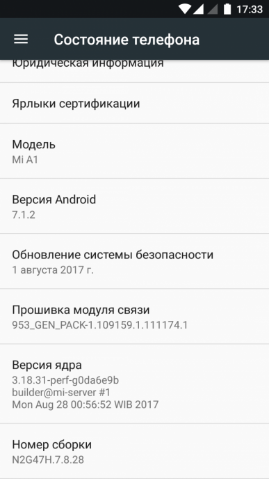 В качестве программной платформы в Xiaomi Mi A1 используется ОС Android не самой уже свежей версии 7.1.2 — естественно, с возможностью обновления по воздуху (ОТА). Как было упомянуто в начале статьи, данный смартфон стал первым аппаратом, выпущенным Xiaomi на чистой ОС Android без собственной фирменной оболочки MIUI, но зато с возможностью длительной поддержки. В то же время, на момент публикации обзора аппарат так и не получил 8-й версии Android (прошло больше двух месяцев), а на пресс-конференции было обозначено, что оперативность выхода обновлений будет ниже, чем, скажем, у тех же смартфонов Google Pixel. Как говорится, время покажет, а пока обратимся к тому, что имеется в наличии.