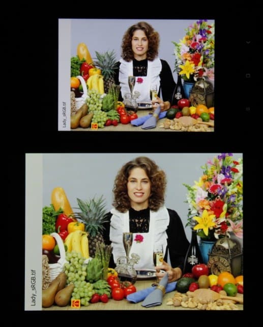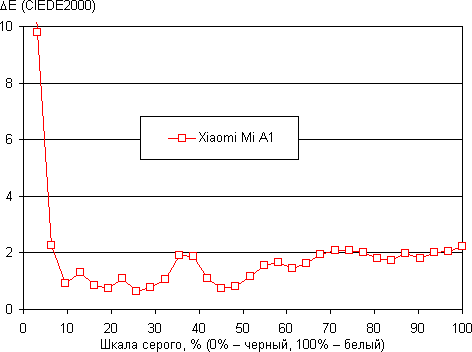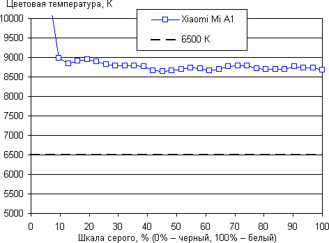 В итоге цвета имеют естественную насыщенность и оттенок. Баланс оттенков на шкале серого компромиссный, так как цветовая температура сильно выше стандартных 6500 К, но отклонение от спектра абсолютно черного тела (ΔE) ниже 3, что для потребительского устройства считается отличным показателем. При этом оба параметра мало изменяются от оттенка к оттенку — это положительно сказывается на визуальной оценке цветового баланса. (Самые темные области шкалы серого можно не учитывать, так как там баланс цветов не имеет большого значения, да и погрешность измерений цветовых характеристик на низкой яркости большая.)